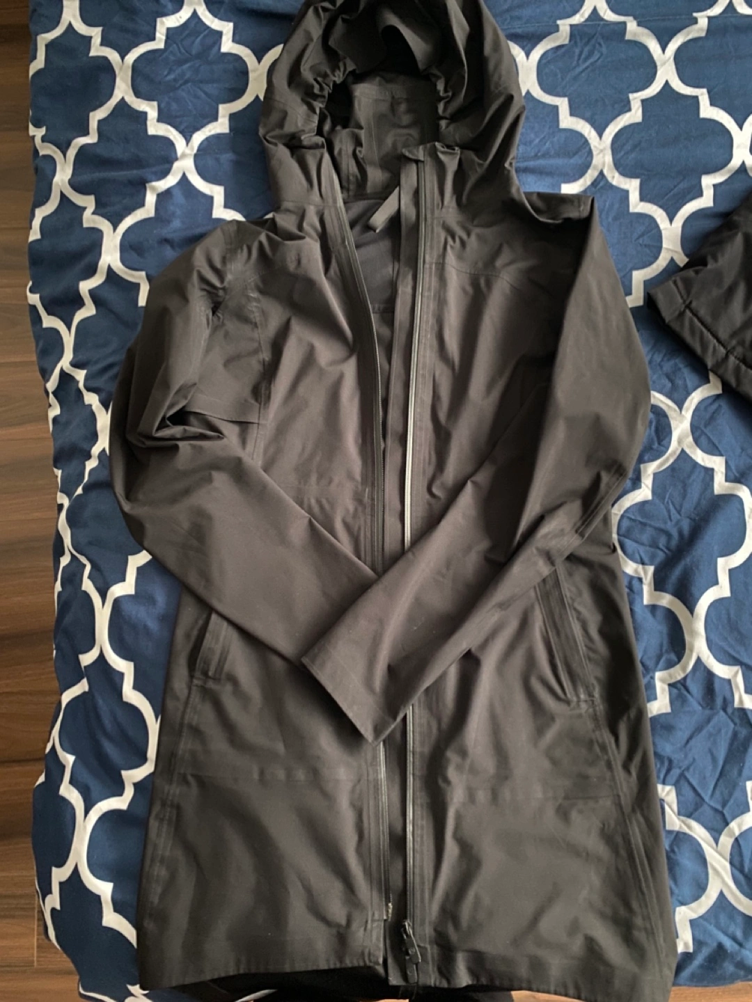Black raincoat with hood. 2 outer pockets & 2 inner zip pockets. Long length. Zipper closure. Adjustable toggles. Shell for rain. No issues, need to size up.