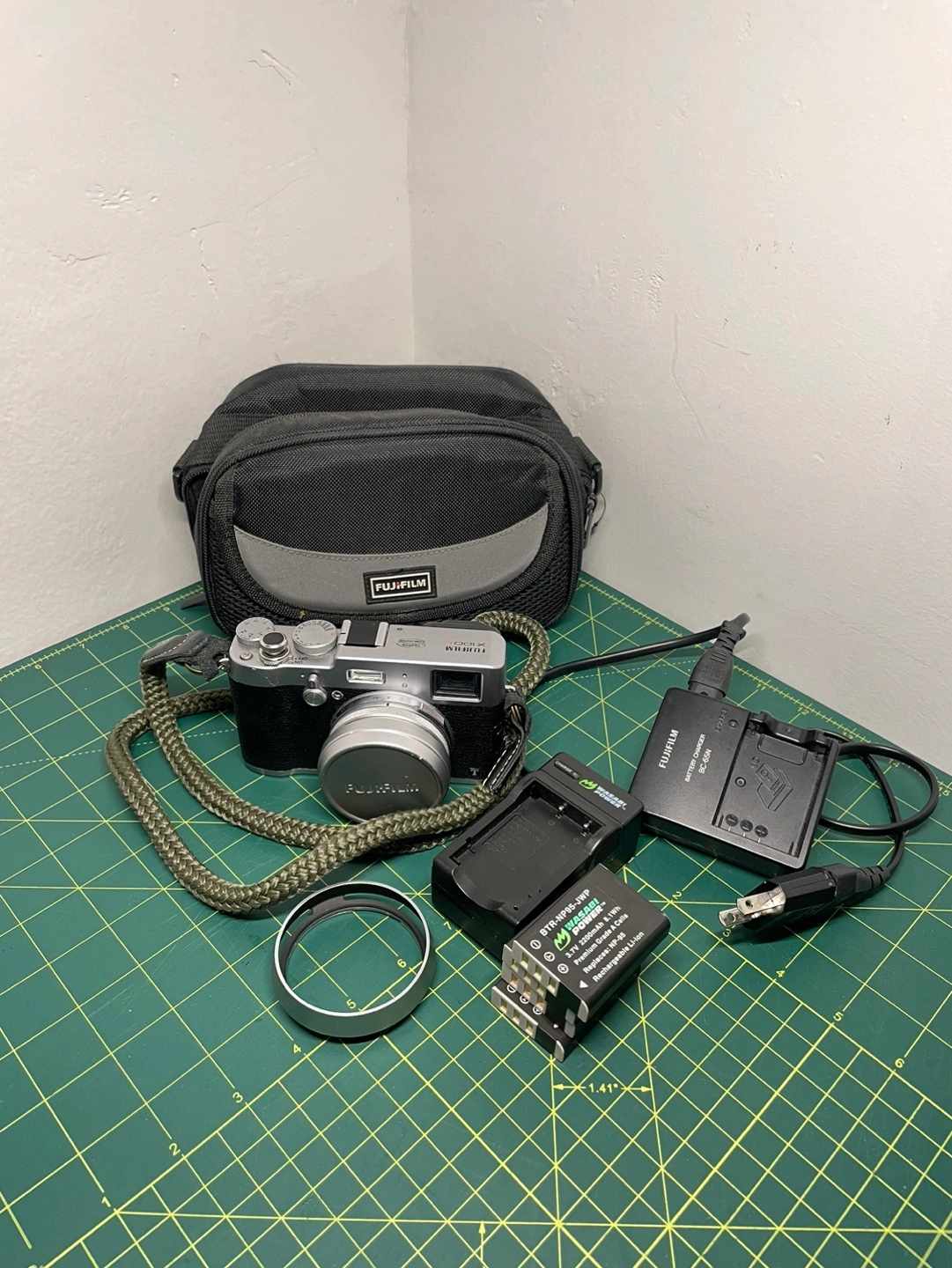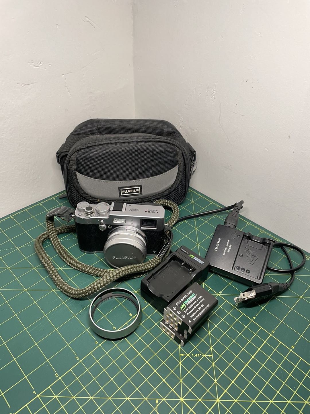 It comes with four batteries, a lens hood, a UV filter, a strap, a lens cap, two chargers, and a bag.