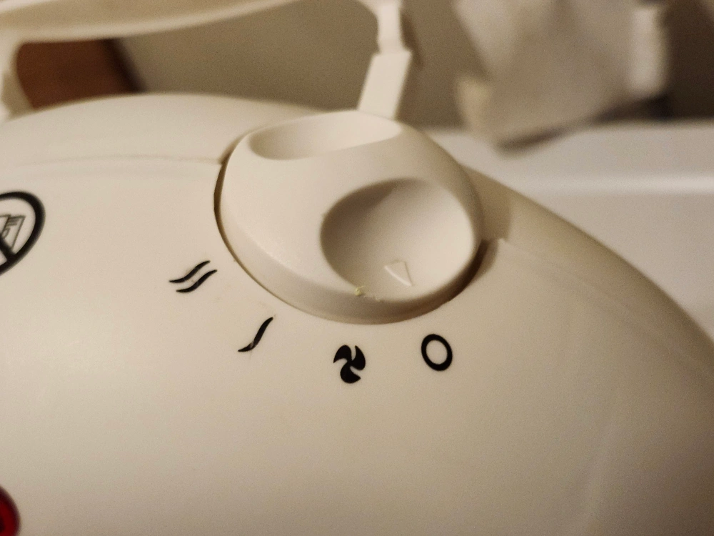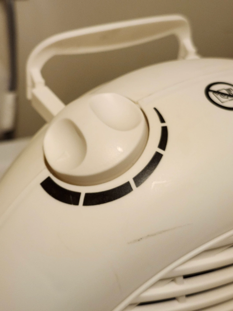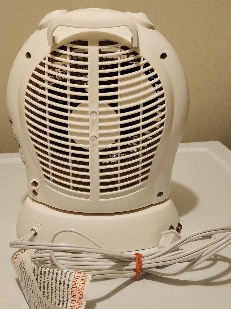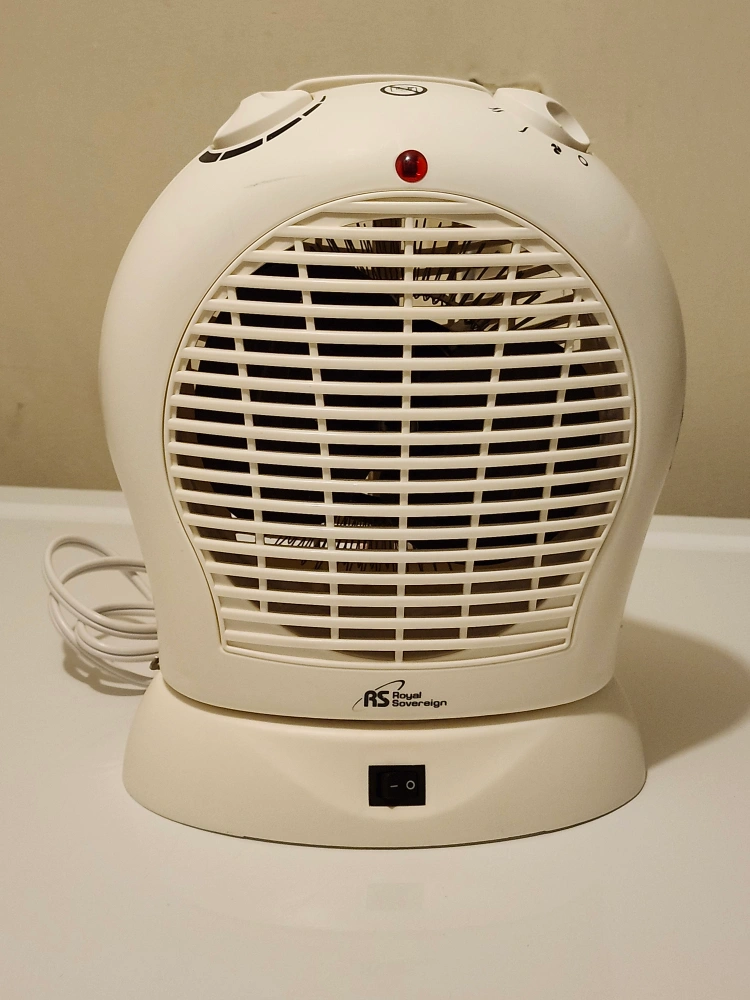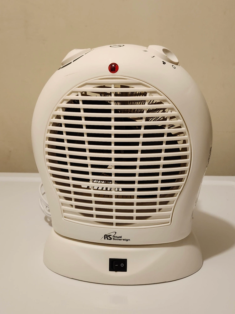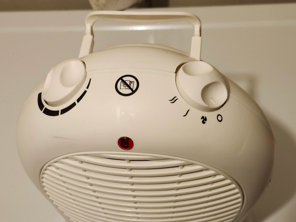 Small space heater, white, with a handle. Has a dial for temperature control, rotation, a dial for fan speed, and a switch for on/off.