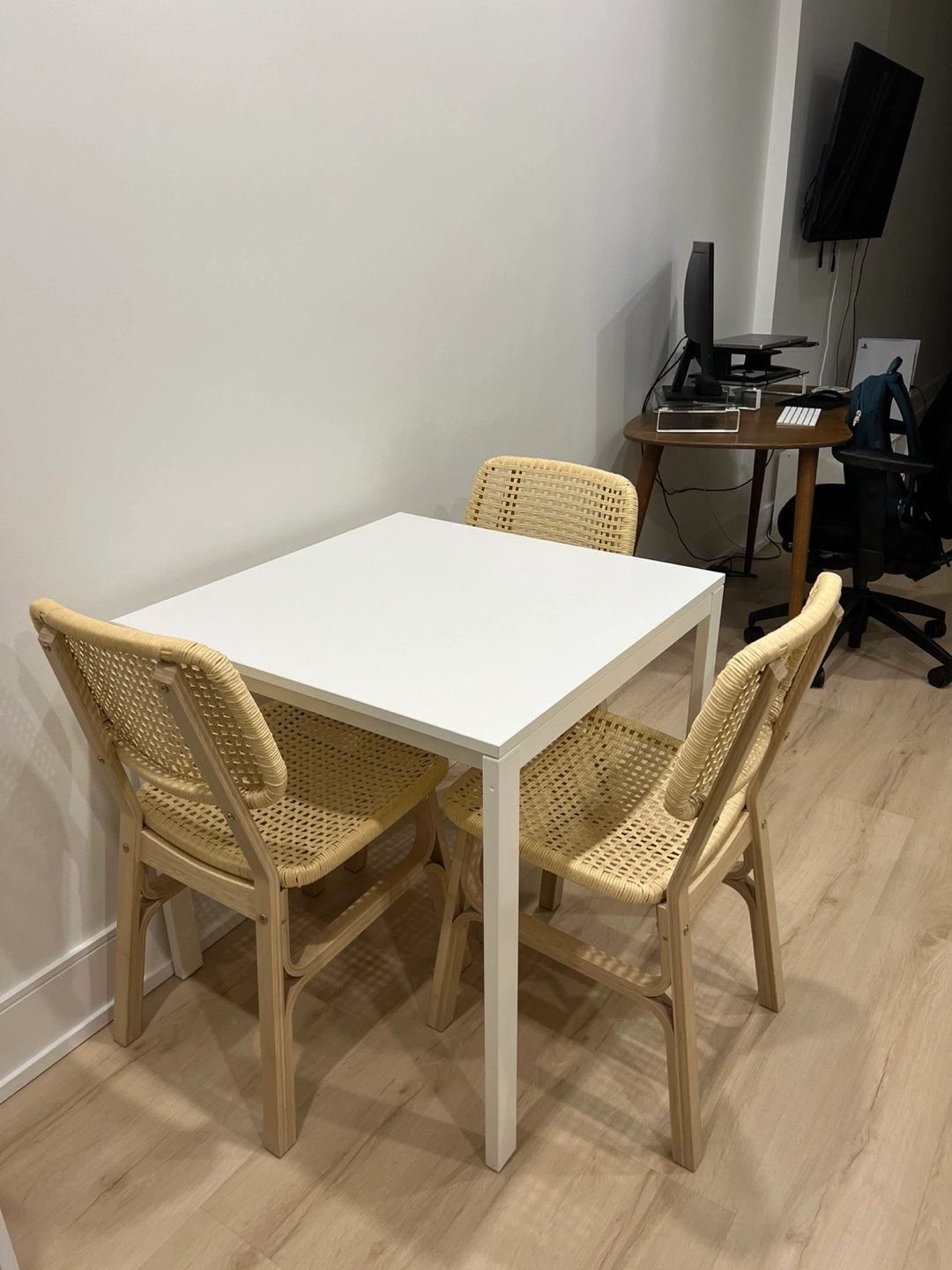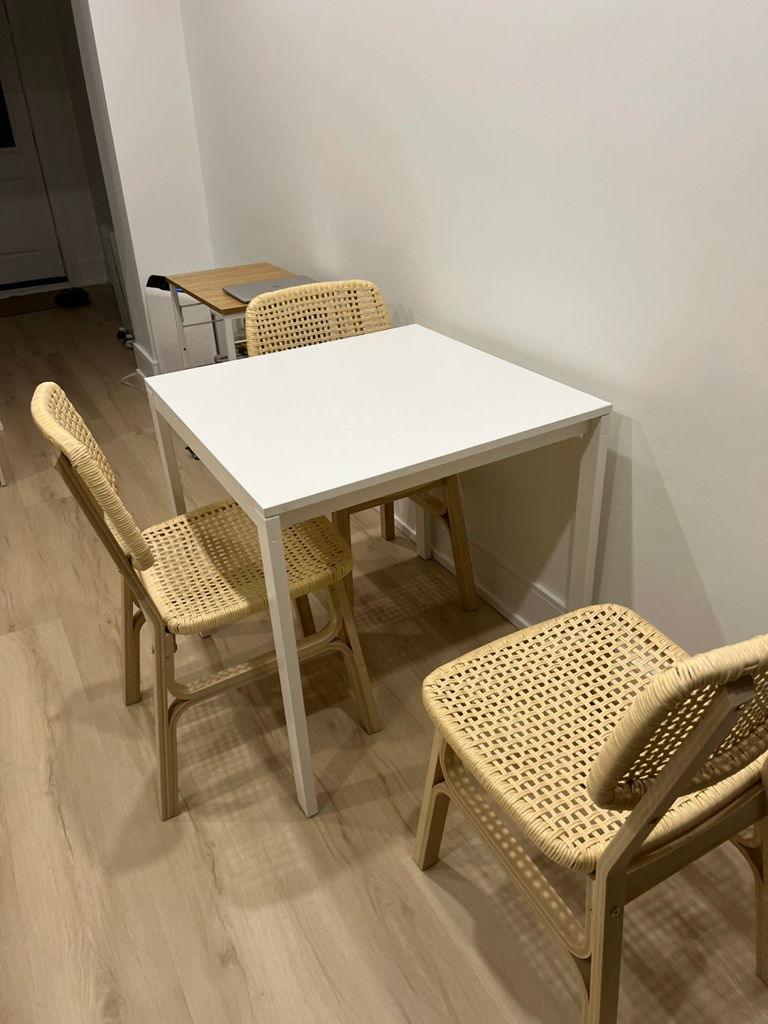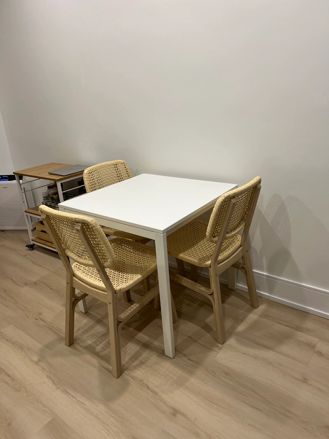 White IKEA “MELLTORP” dining room table. In good condition with minor scratches (barely noticeable). Comes with 3 Voxlov IKEA chairs. Comes from a pet-free and smoke-free home.