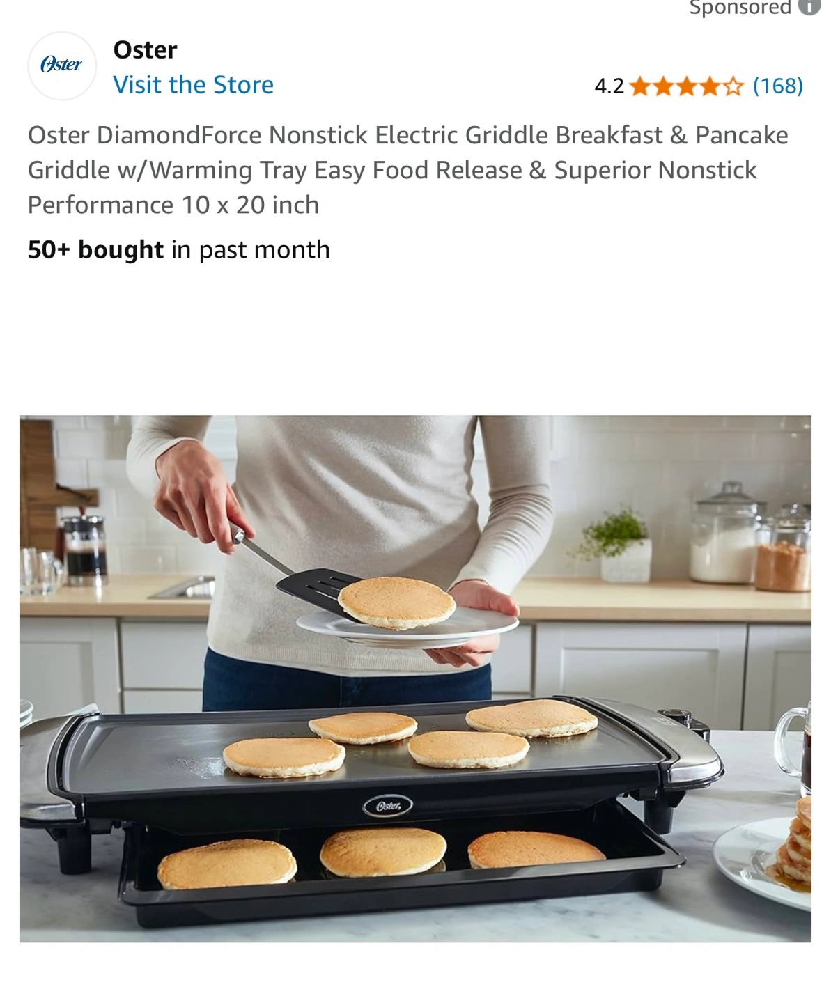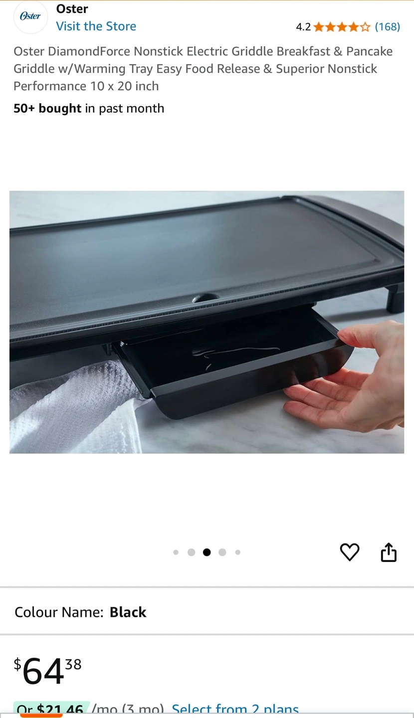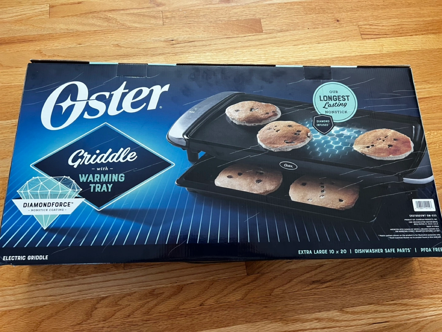 Oster electric griddle with warming tray. 10 x 20 inch. Dishwasher safe parts. PFOA free. DiamondForce nonstick coating. New in the box.