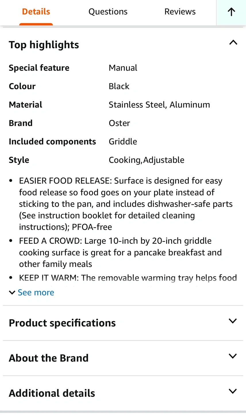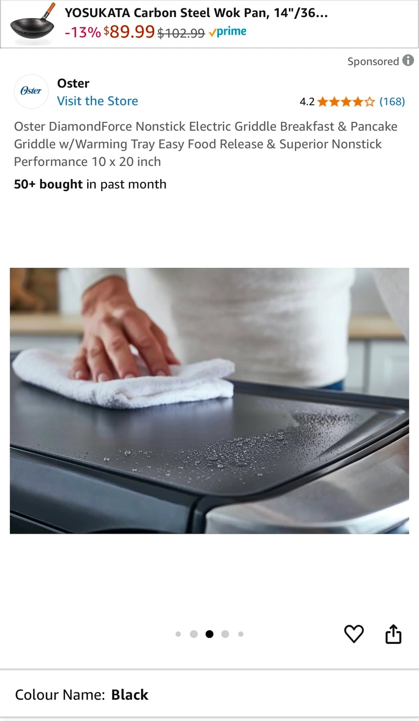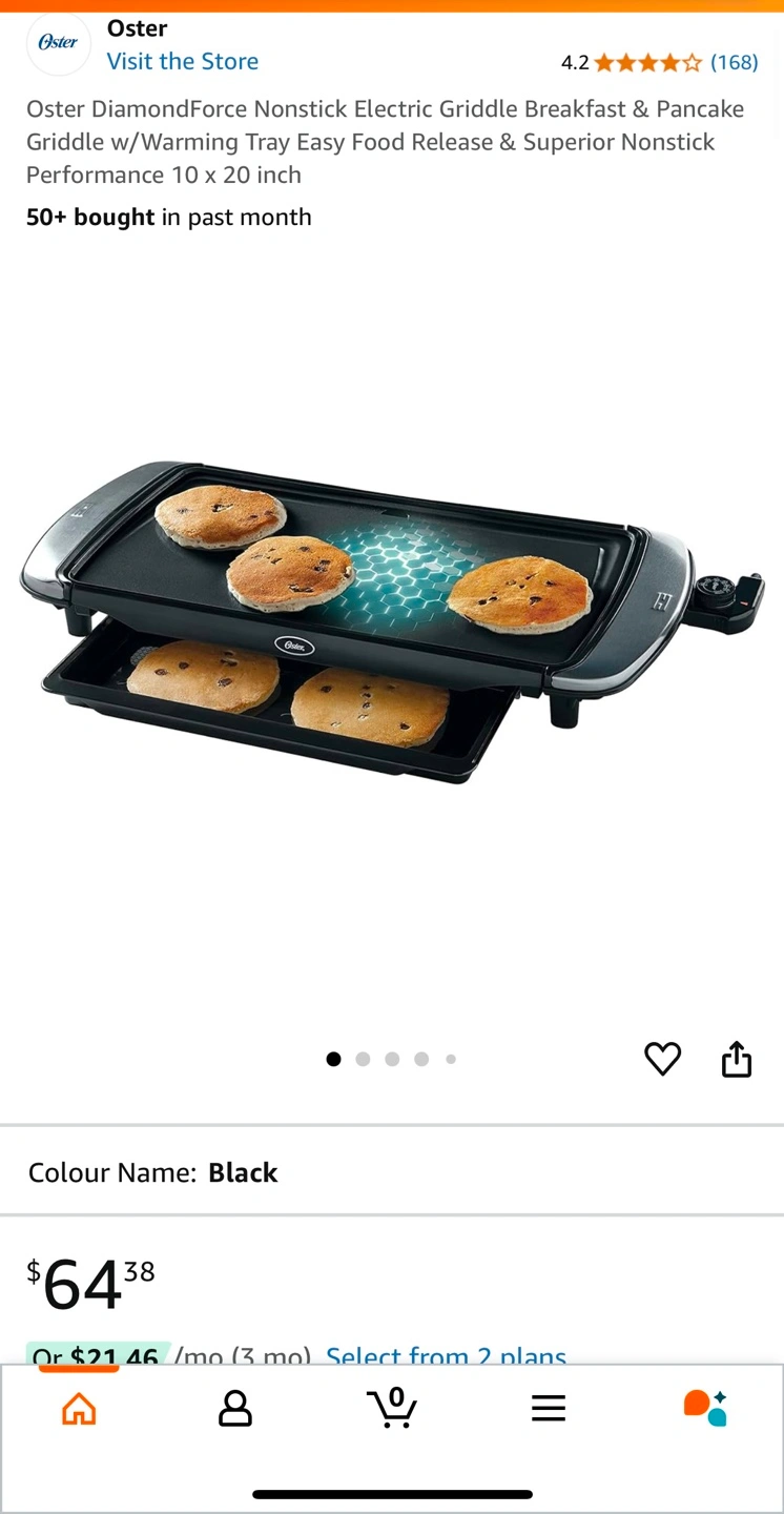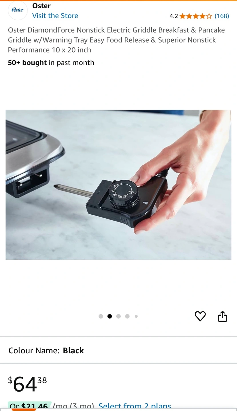 Oster electric griddle with warming tray. 10 x 20 inch. Dishwasher safe parts. PFOA free. DiamondForce nonstick coating. New in the box.