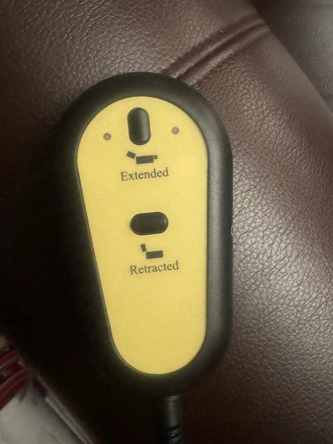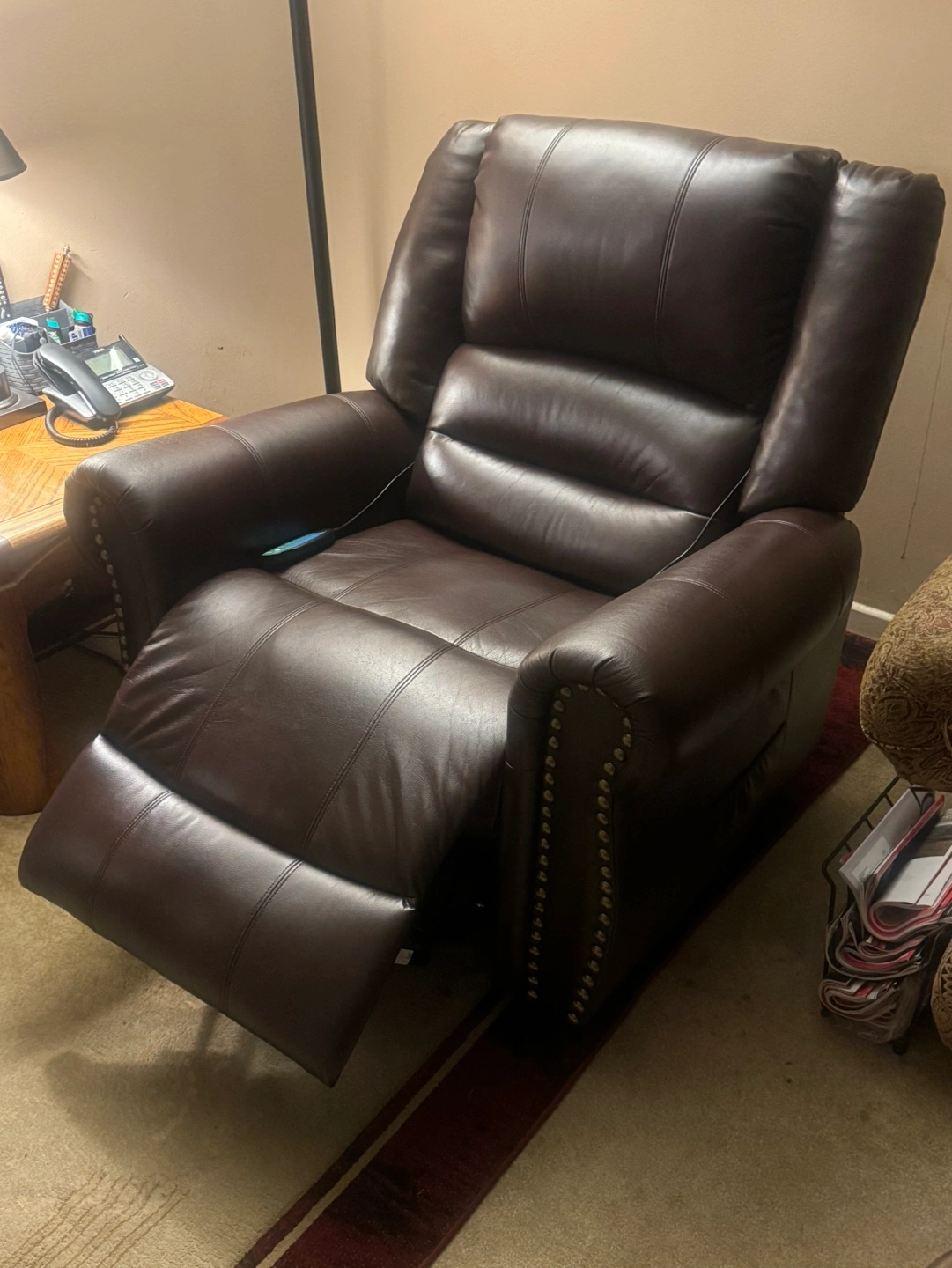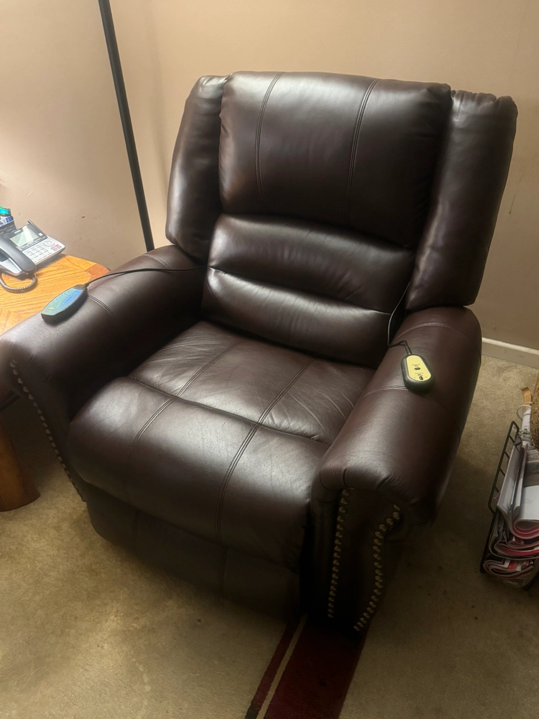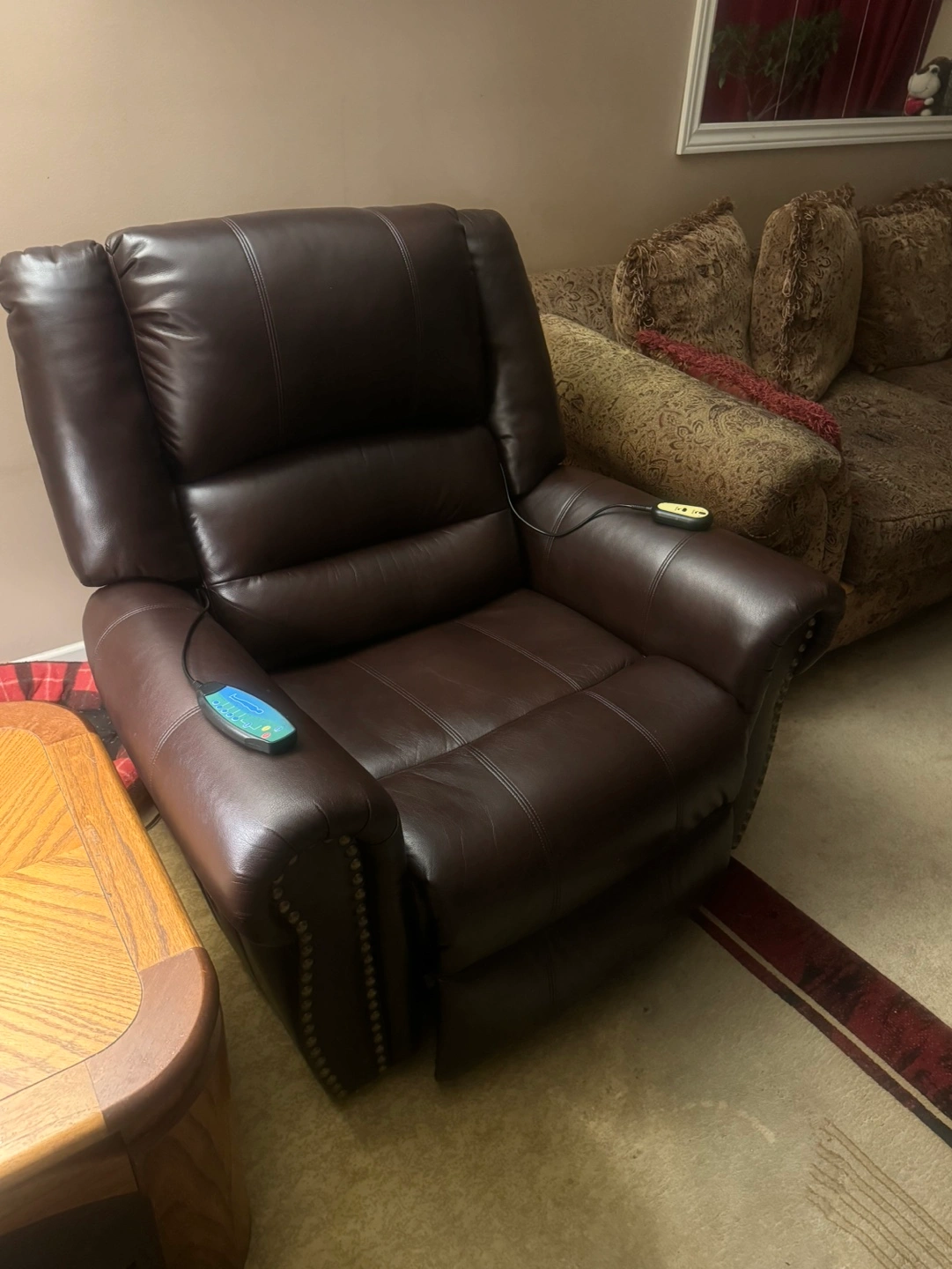 Brown faux leather recliner with heat and massage features. Includes remote controls.
