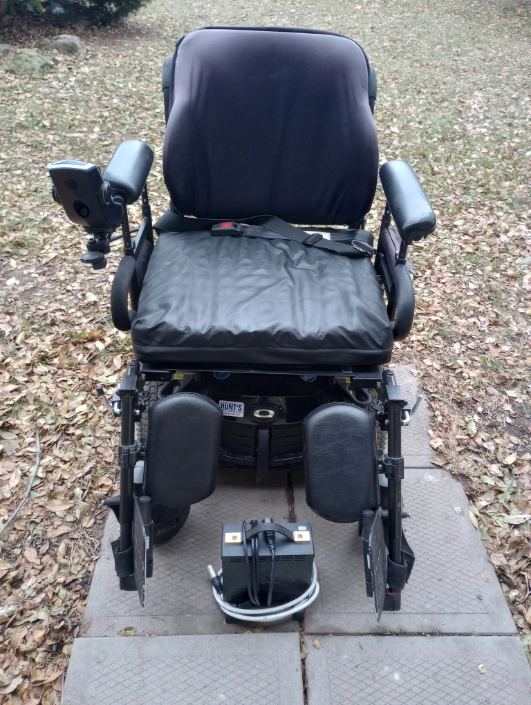 It has a joystick control panel with clock panel,loud horn,seatbelt, ajustible inflatable seat and Battery Charger. New Shocks, Wheels and Casters.