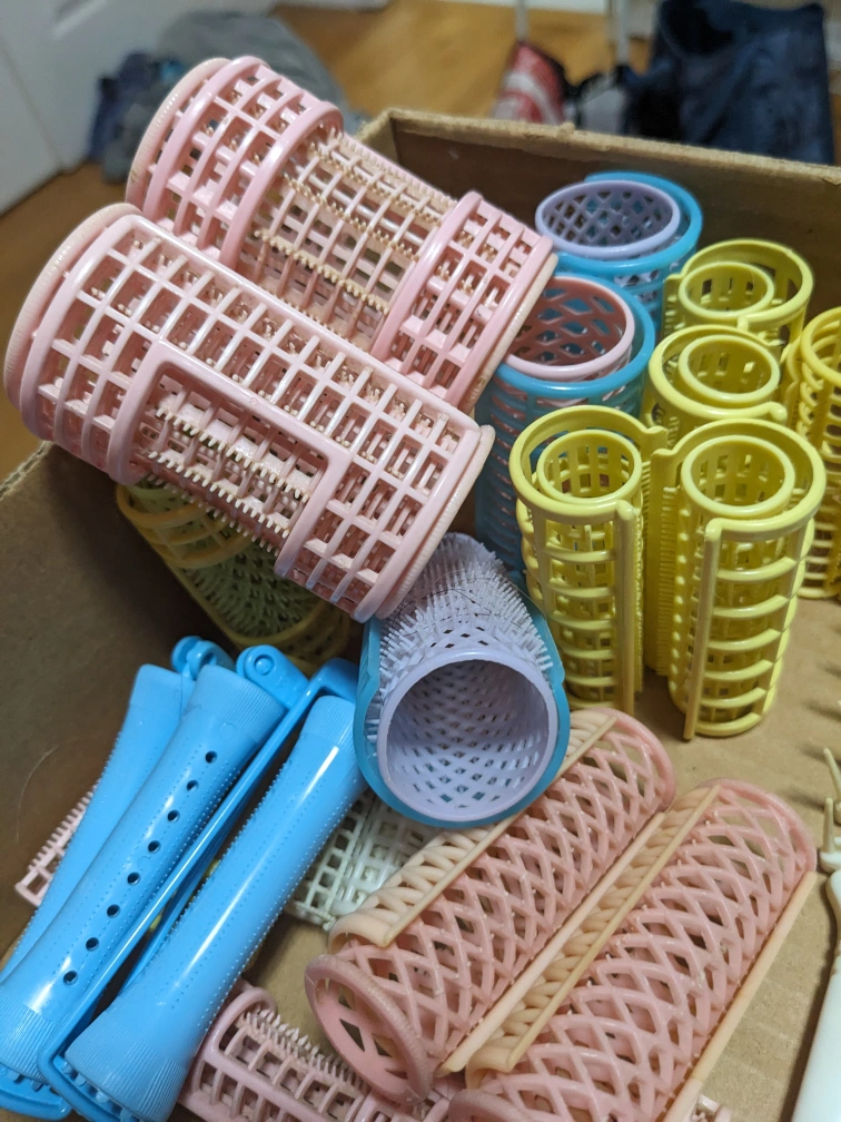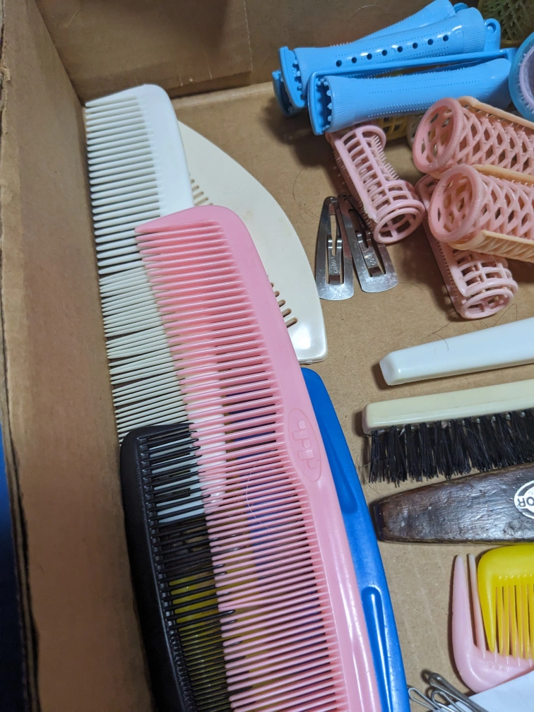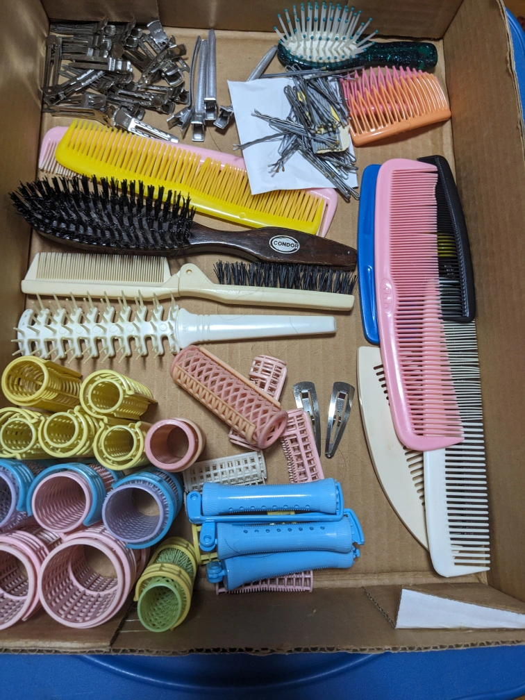 Assortment of hair styling tools and accessories. Everything displayed in the pictures. Includes brushes, combs, hair rollers, clips, and bobby pins.