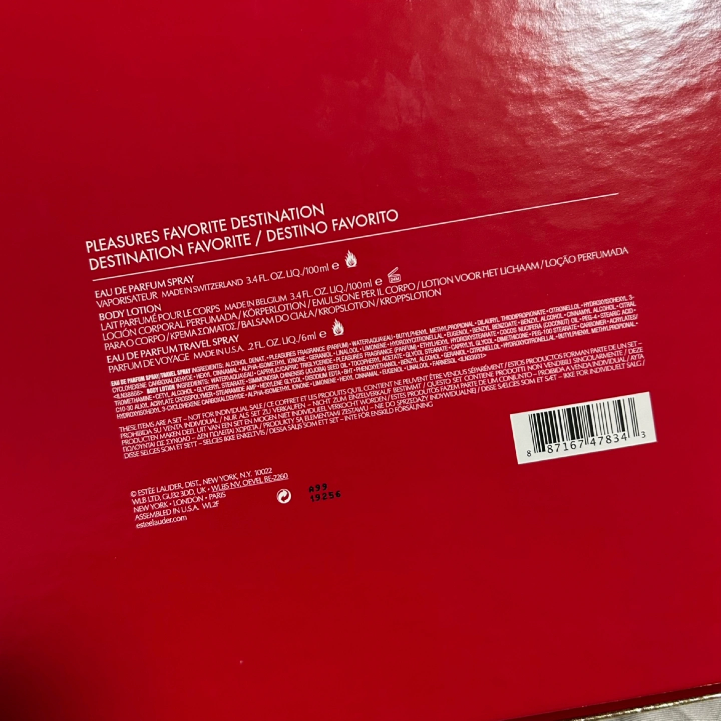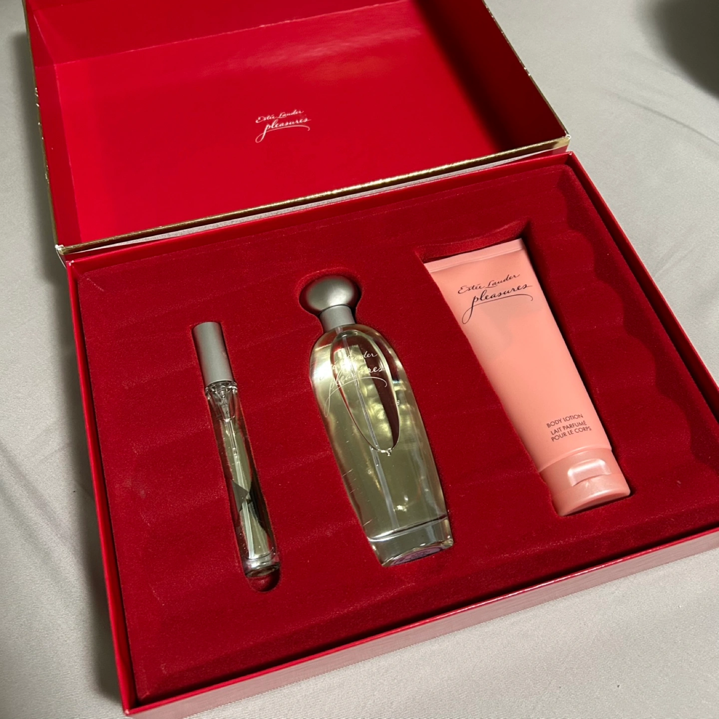 Gift set includes a bottle of perfume, a travel-sized perfume, and a body lotion.