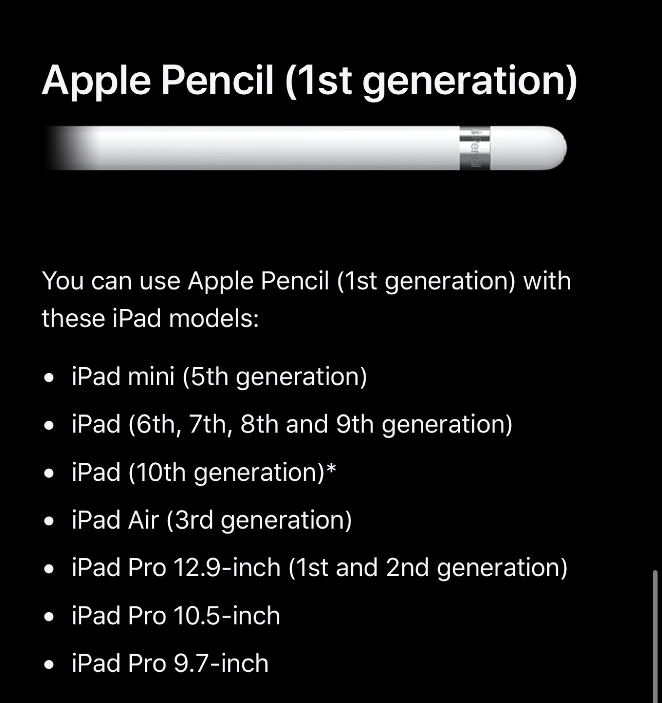 This is first generation Apple Pencil with the removable cap to charge via the Lightning connector. Please see the third photo for iPad compatibility if you’re unsure if it works for your iPad. Selling as-is in good, fully functioning condition.