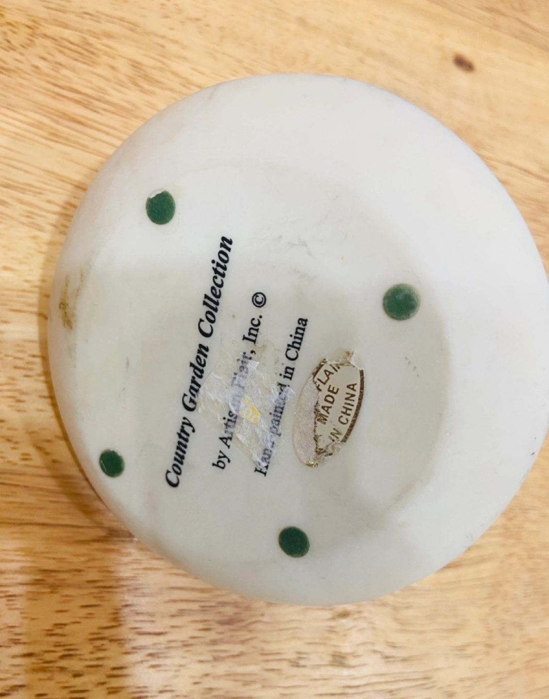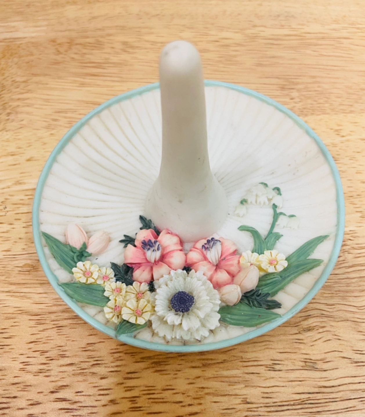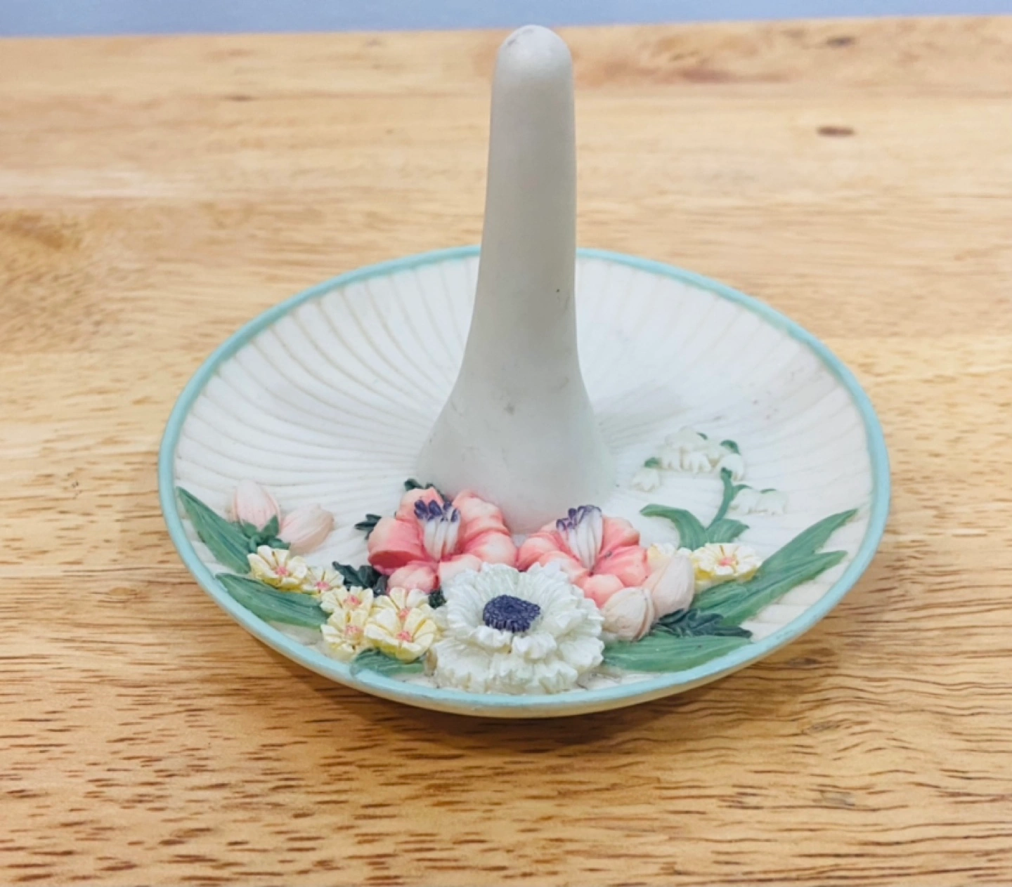Small ceramic ring holder with a floral design. The dish is white and has a light blue trim. It has a raised floral design featuring pink, yellow, and white flowers.