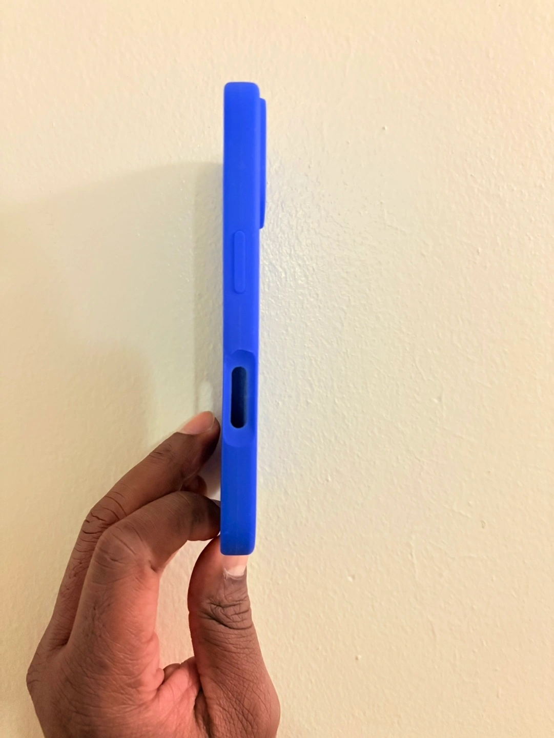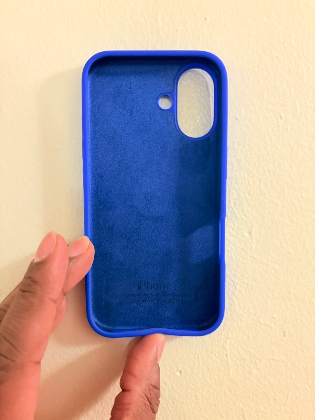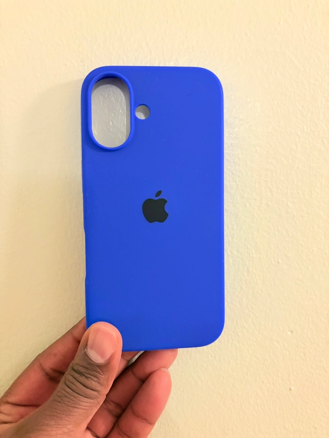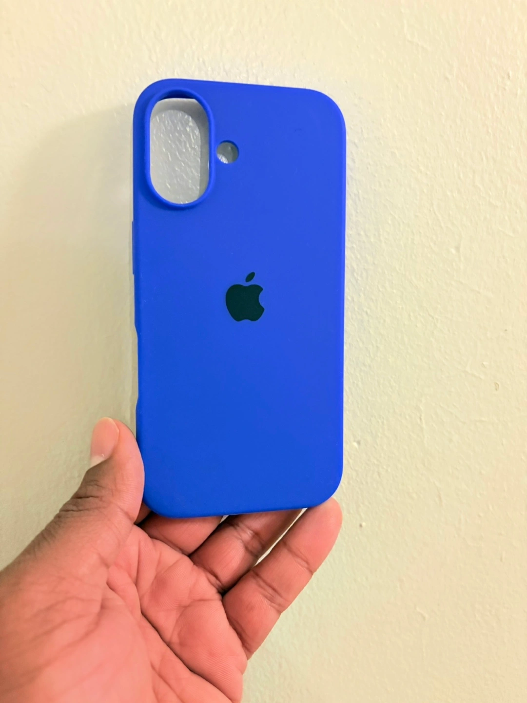 Blue silicone case for iPhone 16. Has cutouts for buttons and charging port. Bought this for 35$ at the Hamilton Mall, but I prefer hard cases instead of silicone. It looked really nice at first since it matches my blue ultramarine iPhone 16. But silicone just not my style. Cant get to like it.