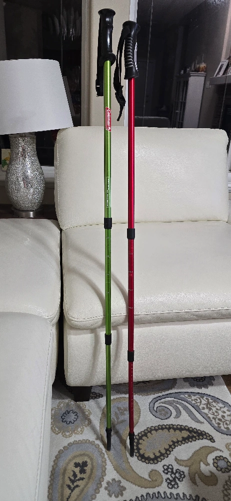 Pair of collapsible trekking poles. One green and one red.Coleman 25.5"(64.5cm) - 52.5"(133cm)