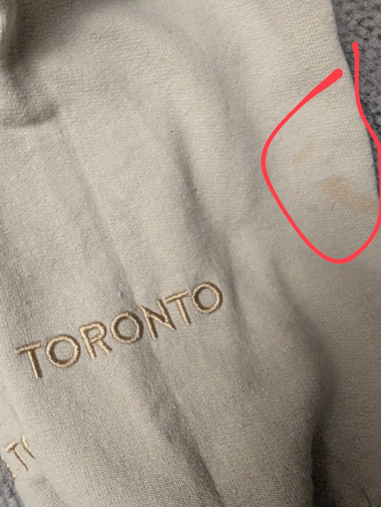 Great condition - has a minor light orange stain by the left sleeve cuff.