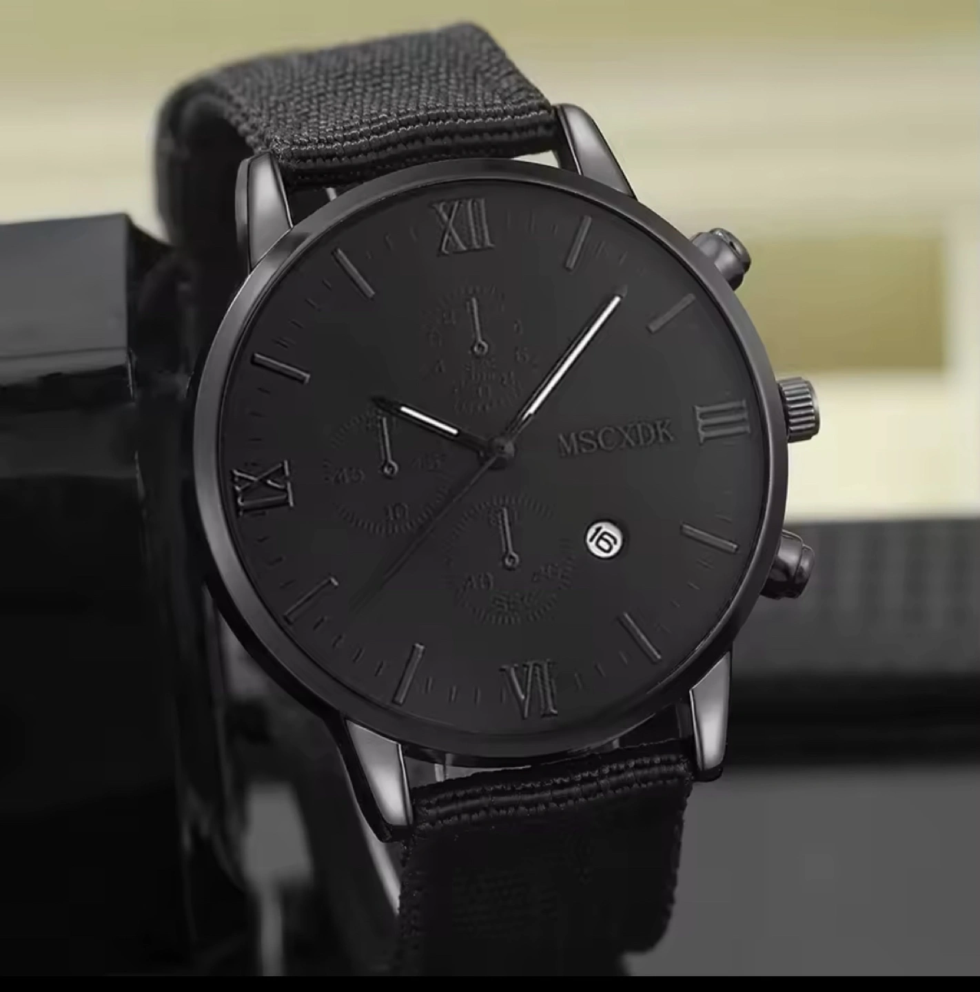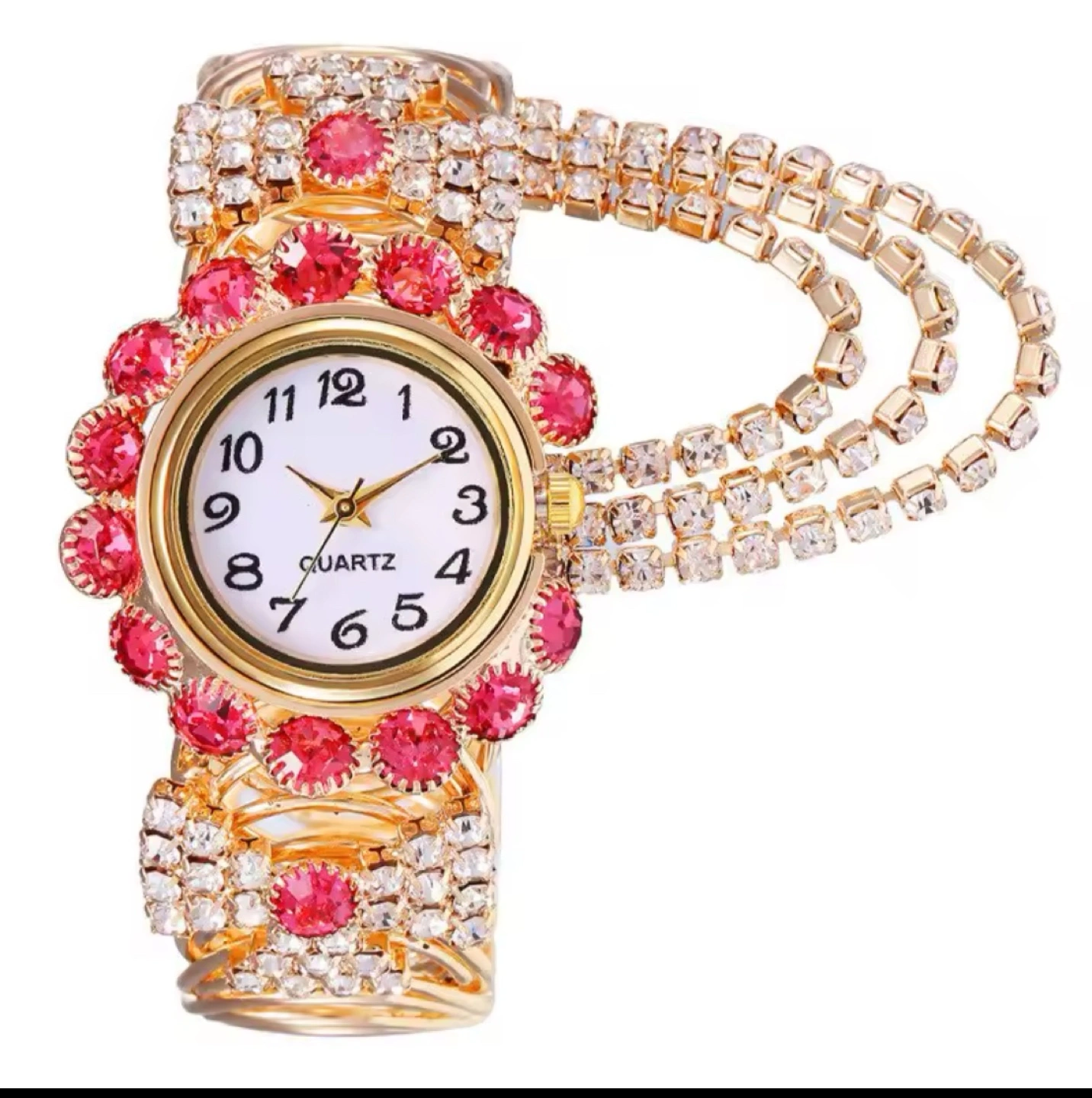 Five stylish wristwatches with varying designs. Includes a watch with a black face and a rose gold band, a blue face with a blue band, a white face with a silver band, a black face with a gold band, and a gold face with a sparkly red band.