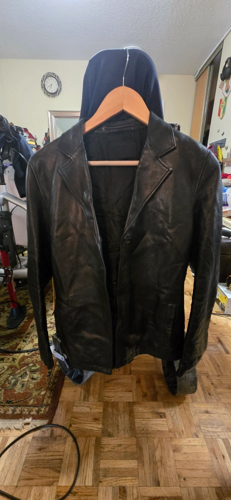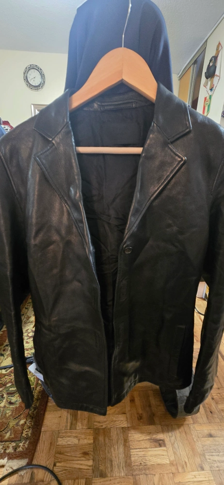 Black leather jacket. Single button closure. Long sleeves. In great condition. was in storage for a little while. no cuts l, scratches , or wear to be seen.