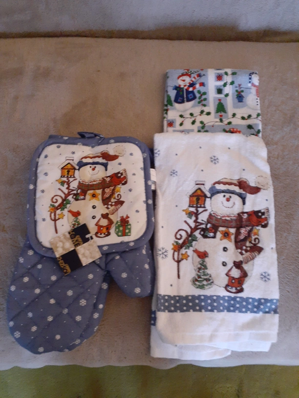 Still Available! Set includes two oven mitts, pot holder and one tea towel. Also include one extra new tea towel. Cash and Porch Pickup close to Willowdale middle school OR NorthYork Centre Station/ Empress Walk.