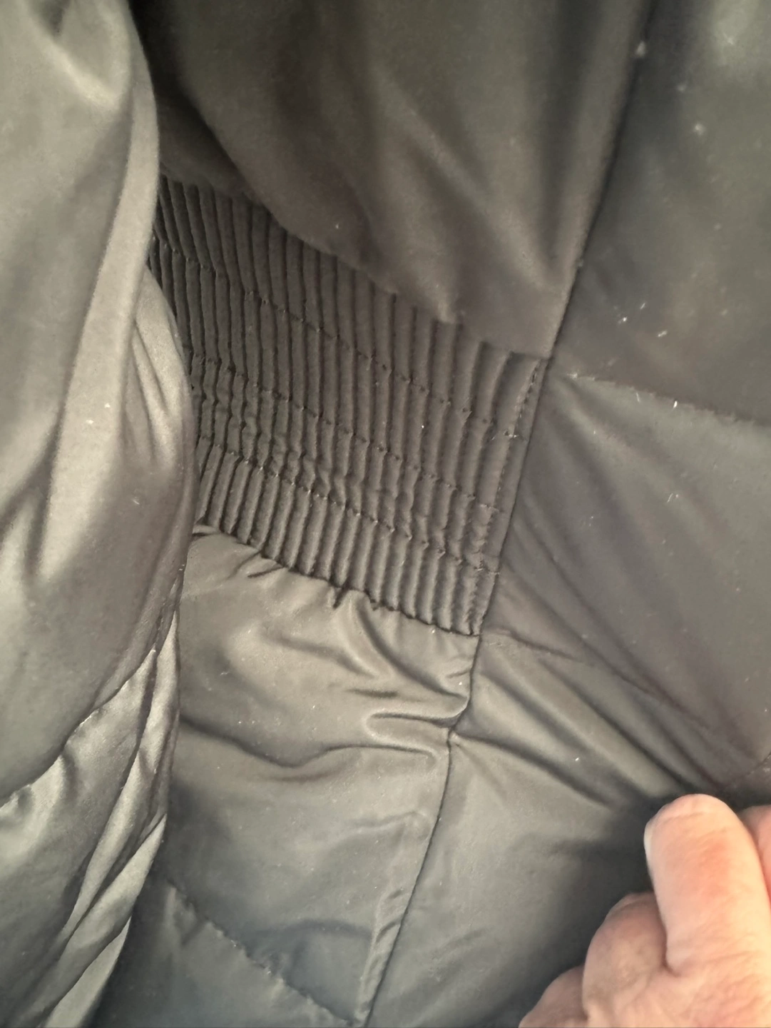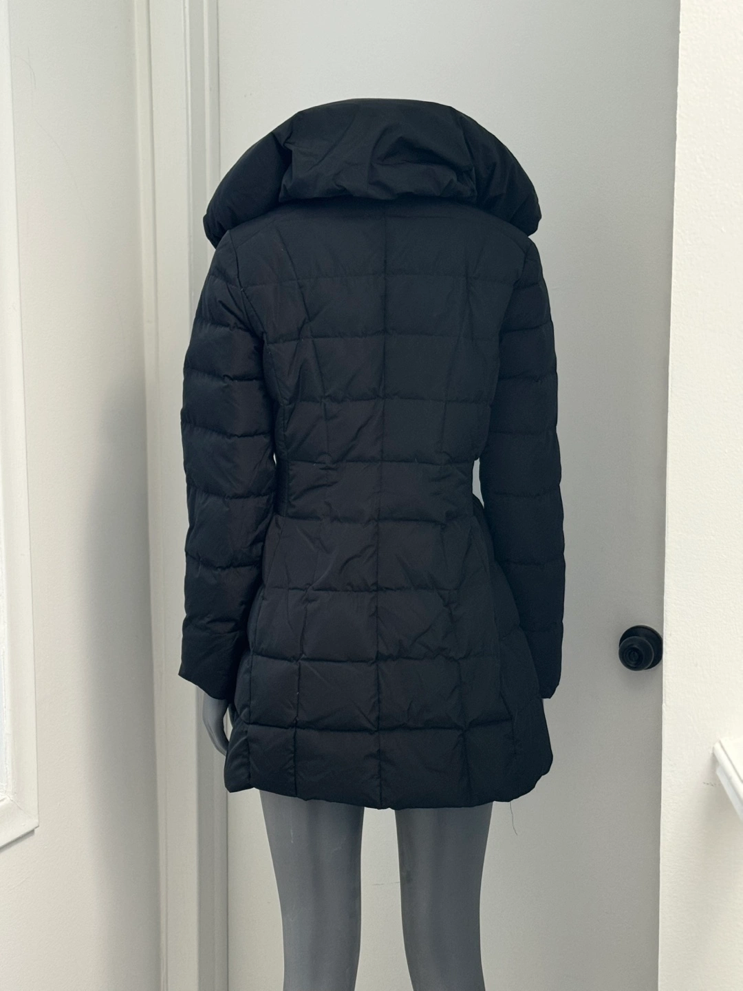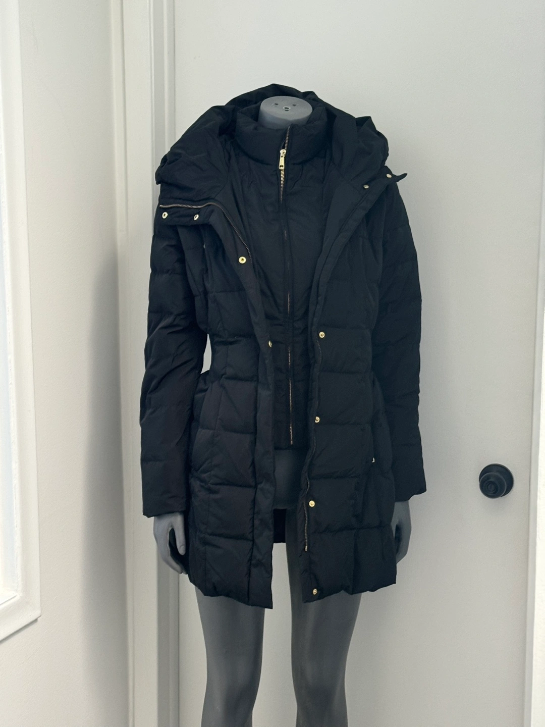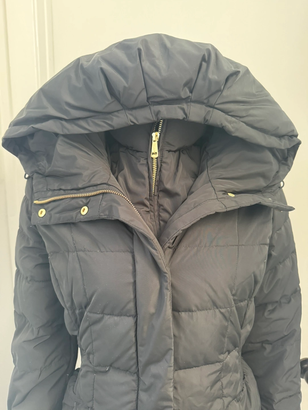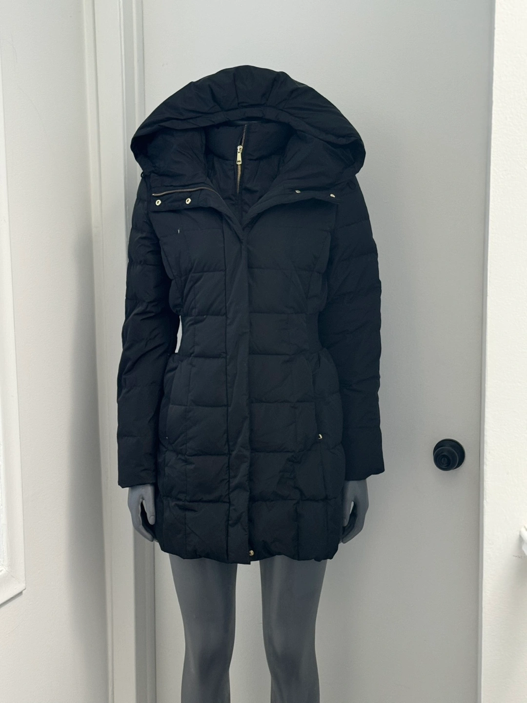 Black puffer jacket with hood, gold zipper and buttons. Features a cinched waist. Paid 450.00