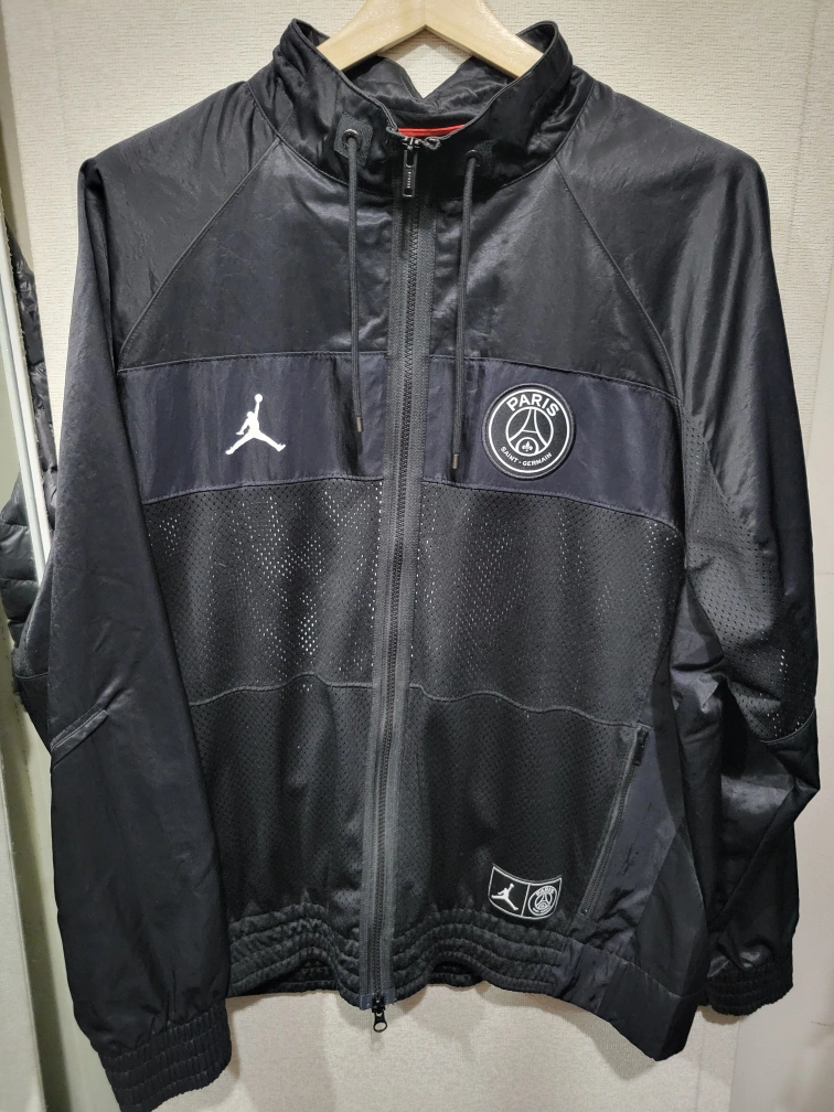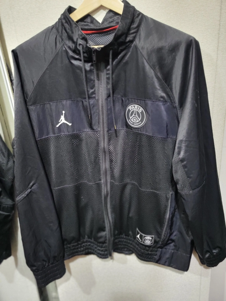 Black track jacket with Paris Saint-Germain and Jordan branding. Features a full zipper and mesh panels. Size Large