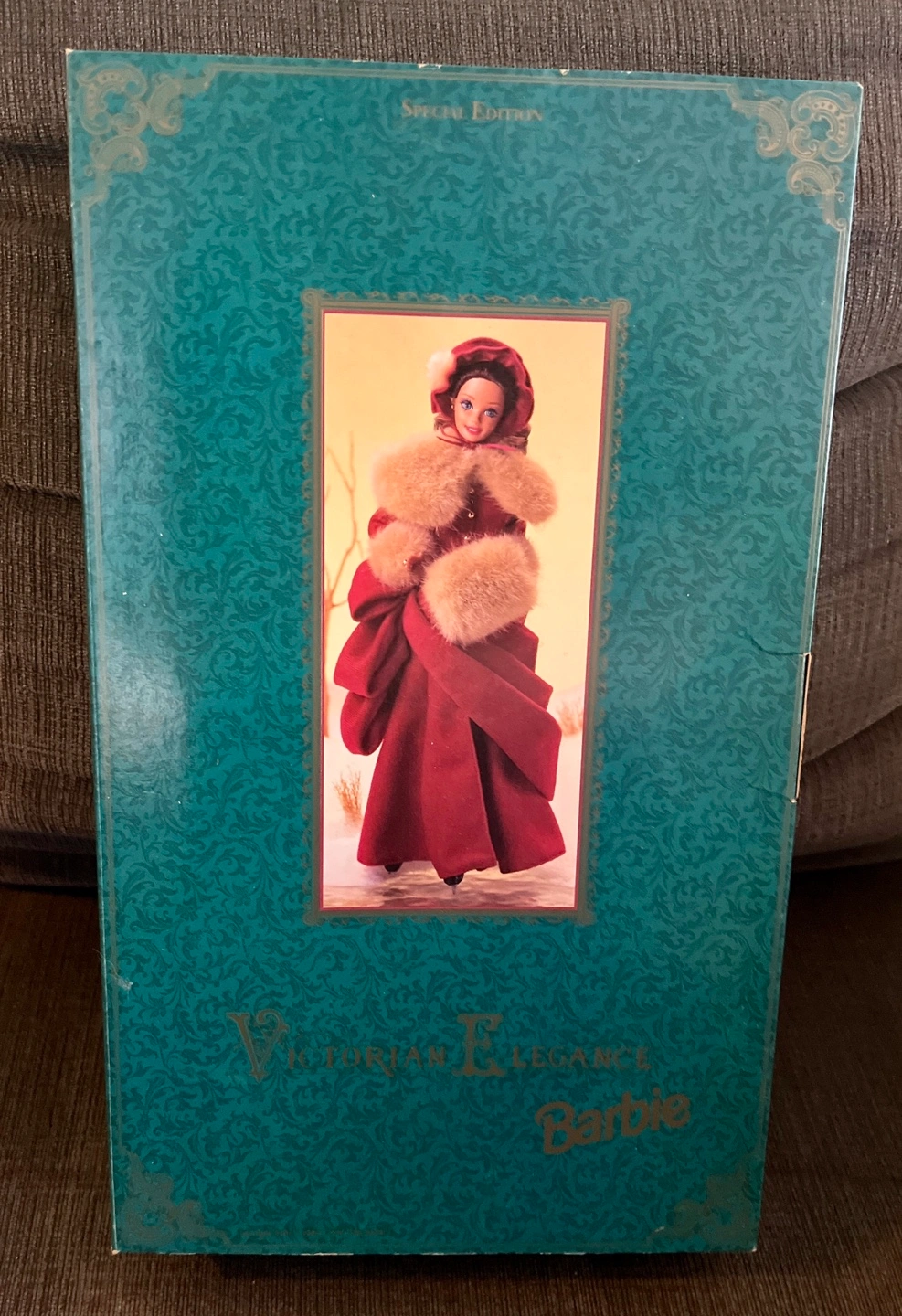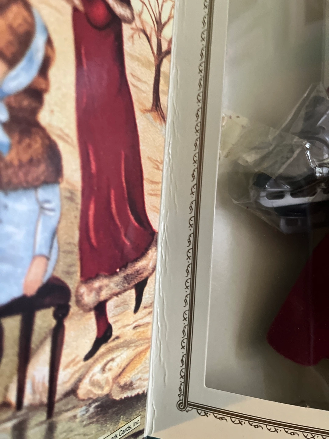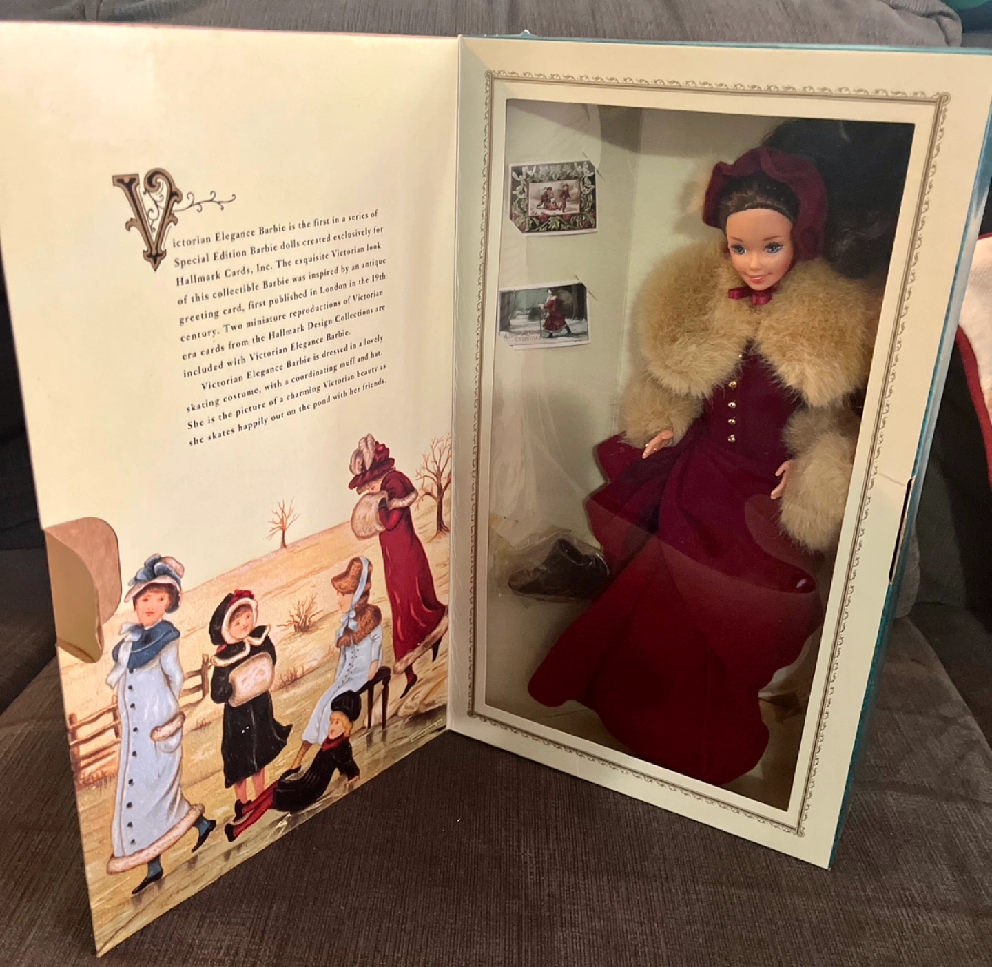 This is a Hallmark Special Edition Victorian Elegance Barbie from 1994. She is still new in the box and comes with a stand, figure skates and paper accessories. The box is a bit worn in places as shown in photos and the tape holding the skates to the cardboard inside has loosened with age.