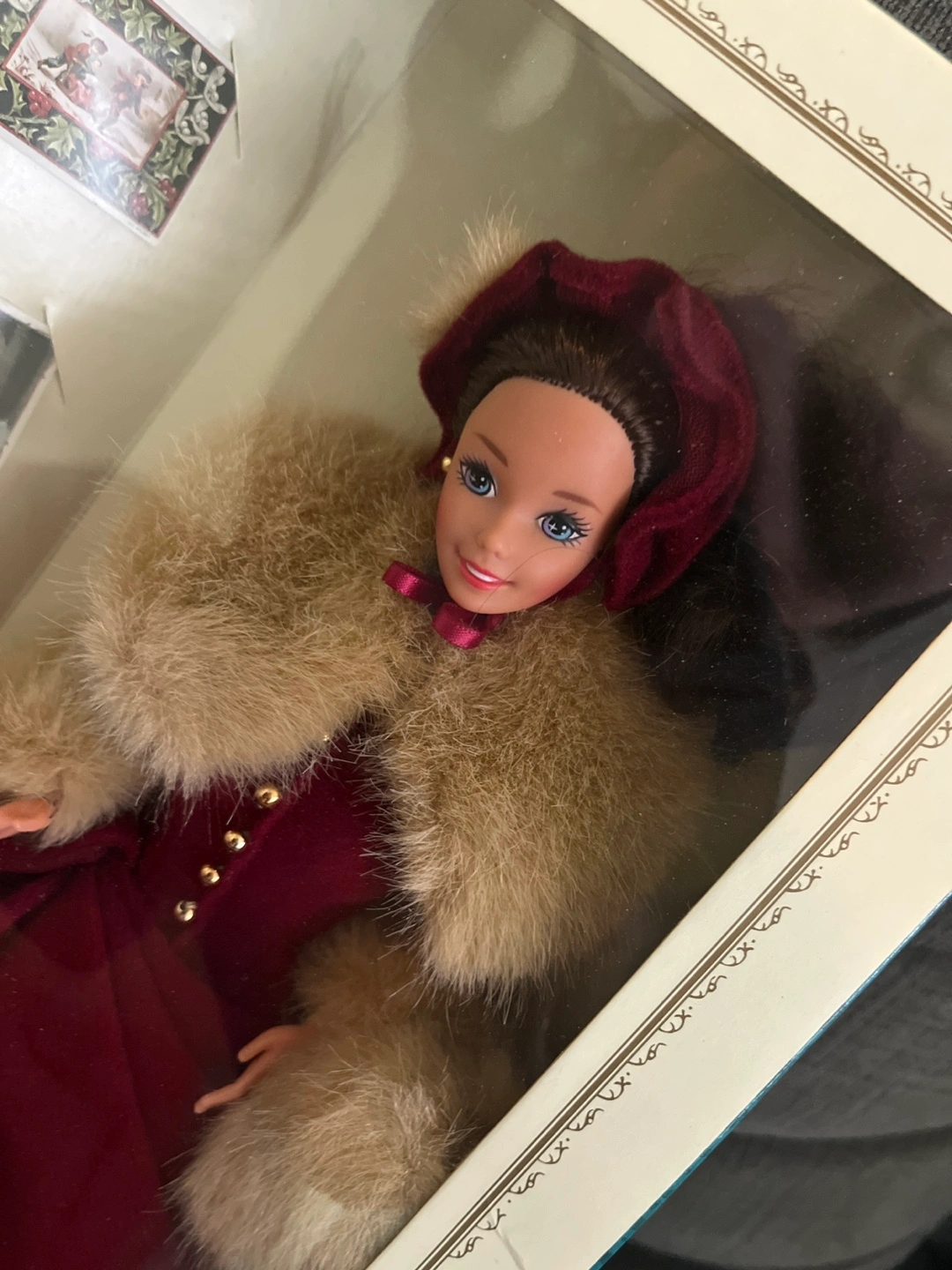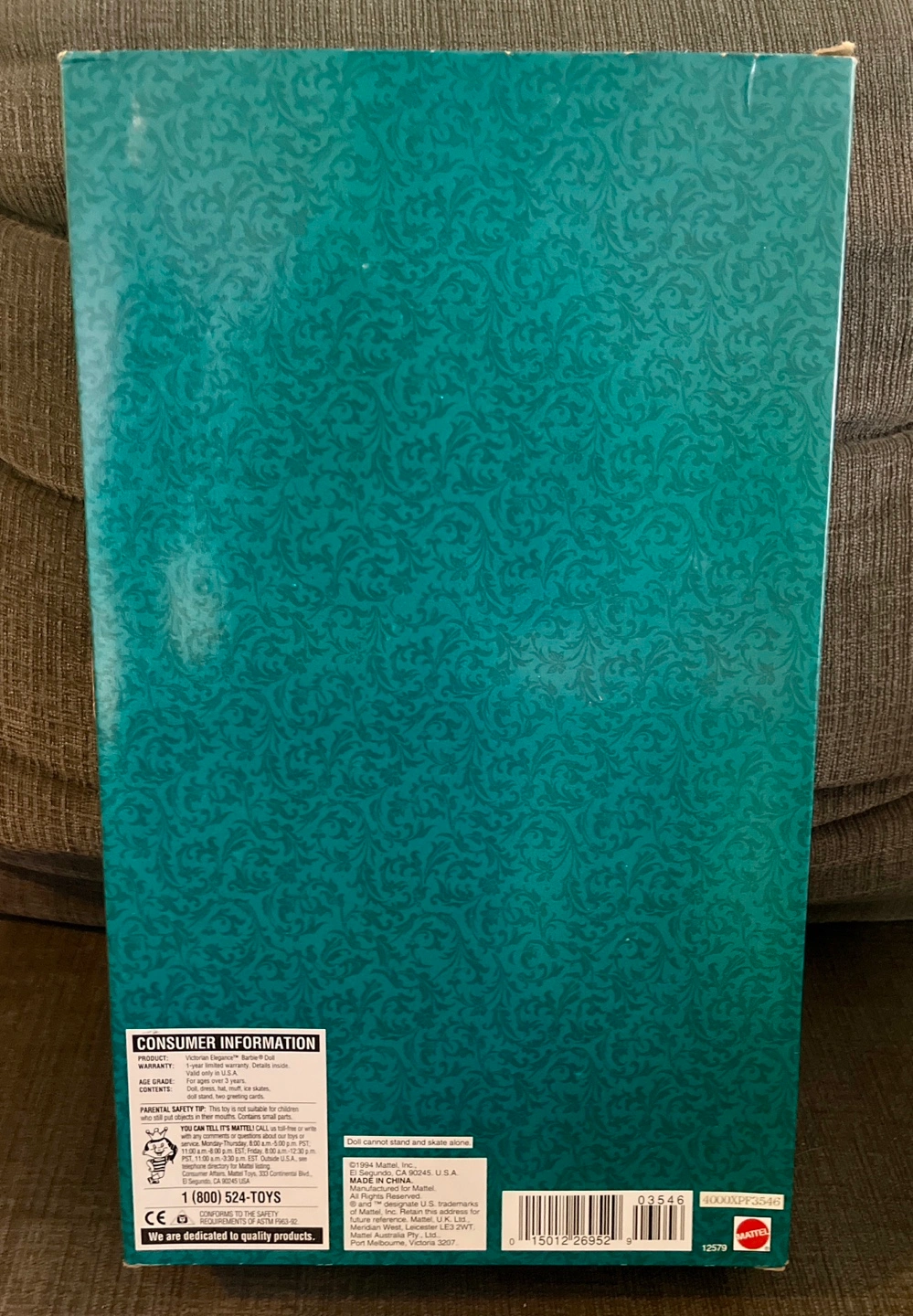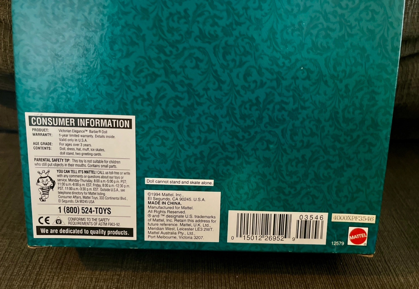 This is a Hallmark Special Edition Victorian Elegance Barbie from 1994. She is still new in the box and comes with a stand, figure skates and paper accessories. The box is a bit worn in places as shown in photos and the tape holding the skates to the cardboard inside has loosened with age.