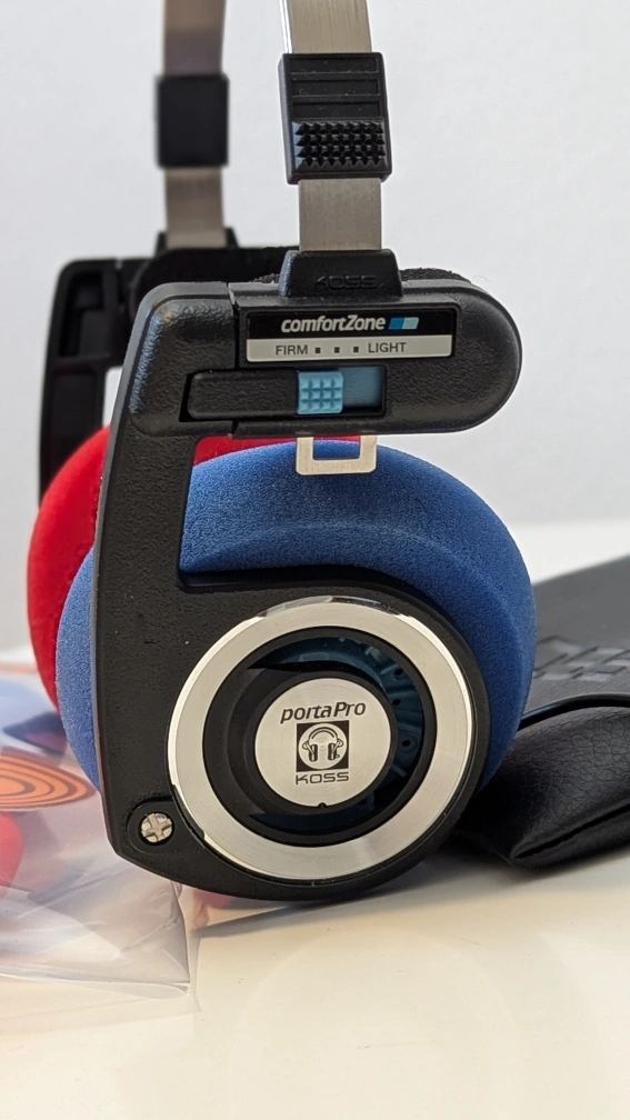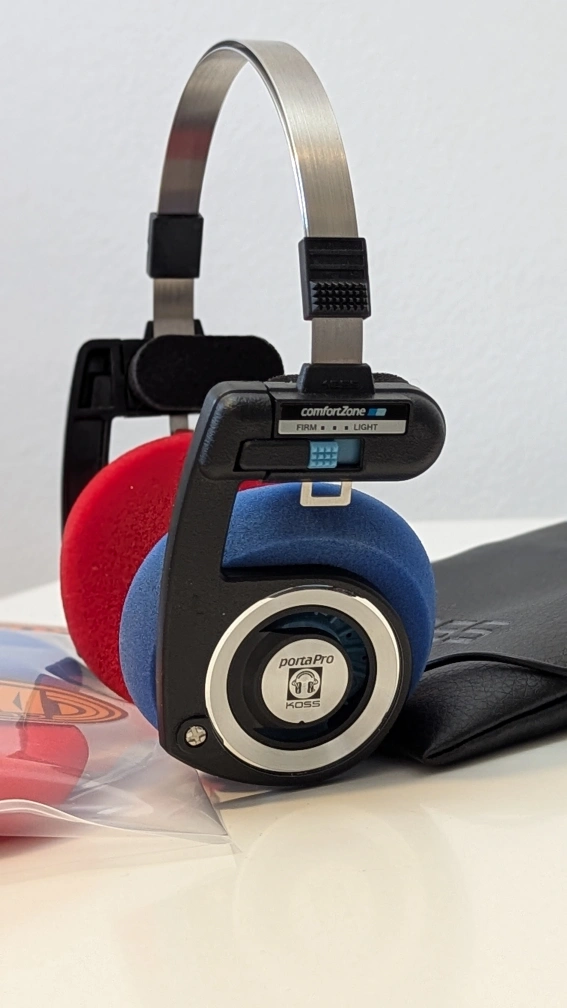 Koss Porta Pro headphones with a carrying case, original unused pads and YAXI ear pads from Japan. These iconic open over ear headphones are in great condition, gives off 80s vintage vibes and are adored by audiophiles for their clarity.