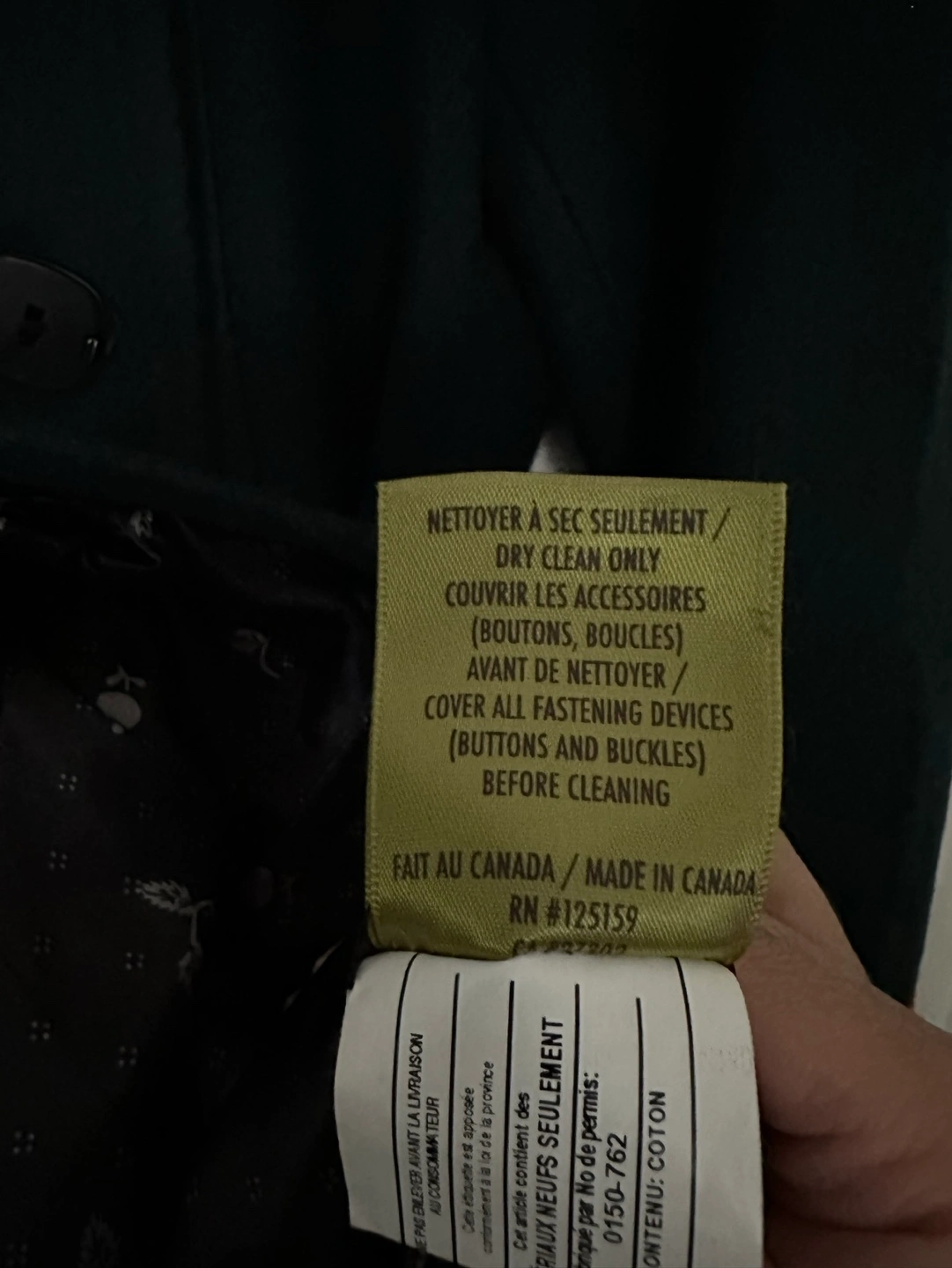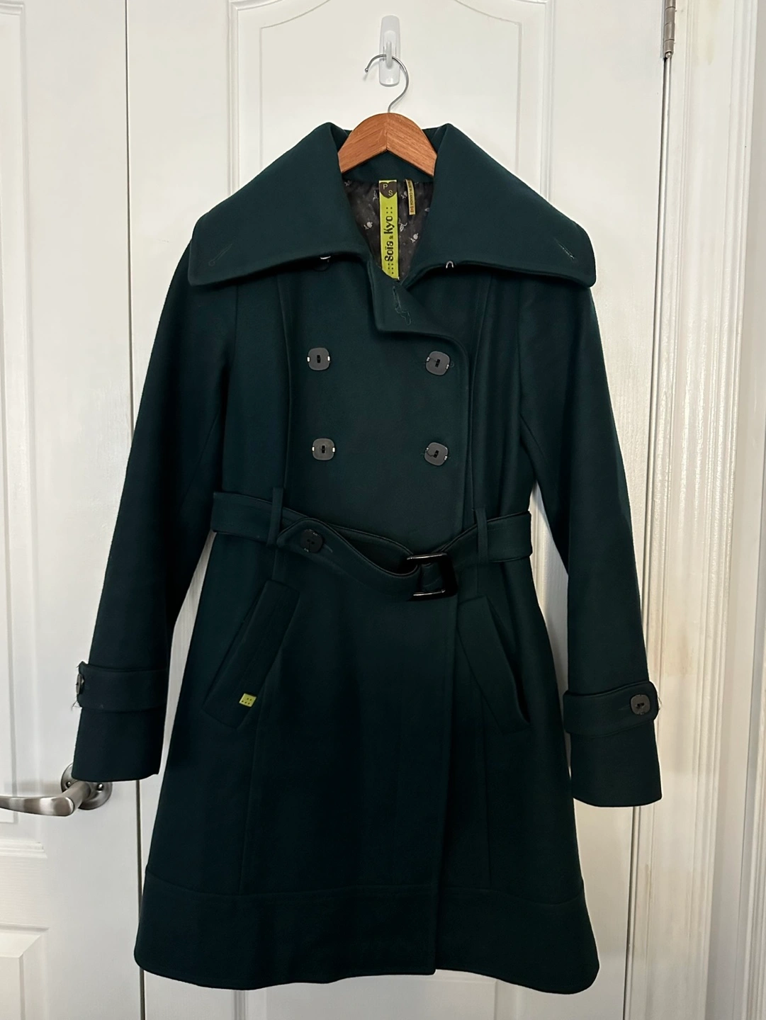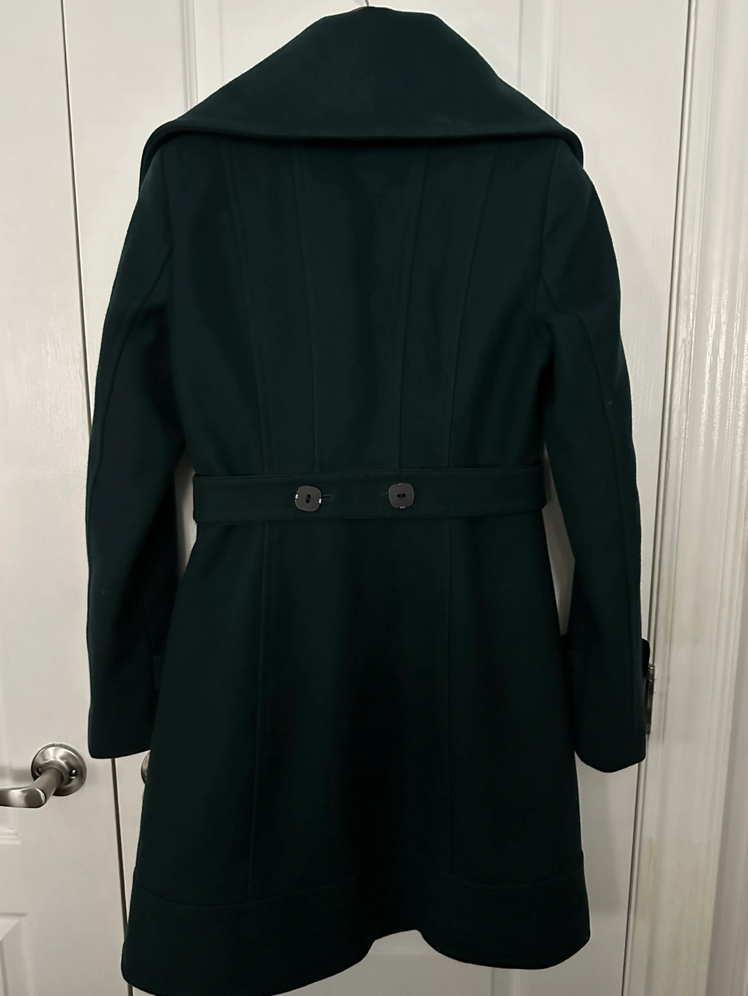 ▪️ beautiful dark green wool coat ▪️ wide collar with fastener for higher neck coverage ▪️ double-breasted closure ▪️ belt ▪️ made in Canada ▪️ excellent like-new condition • brand: Soia & Kyo • size: small • outershell: 80% wool, 20% nylon • lining: 100% polyester • interlining: 100% cotton • excellent preowned condition • smoke-free/pet-free/pest-free home Pickup in Wallace/Emerson Cash only, please