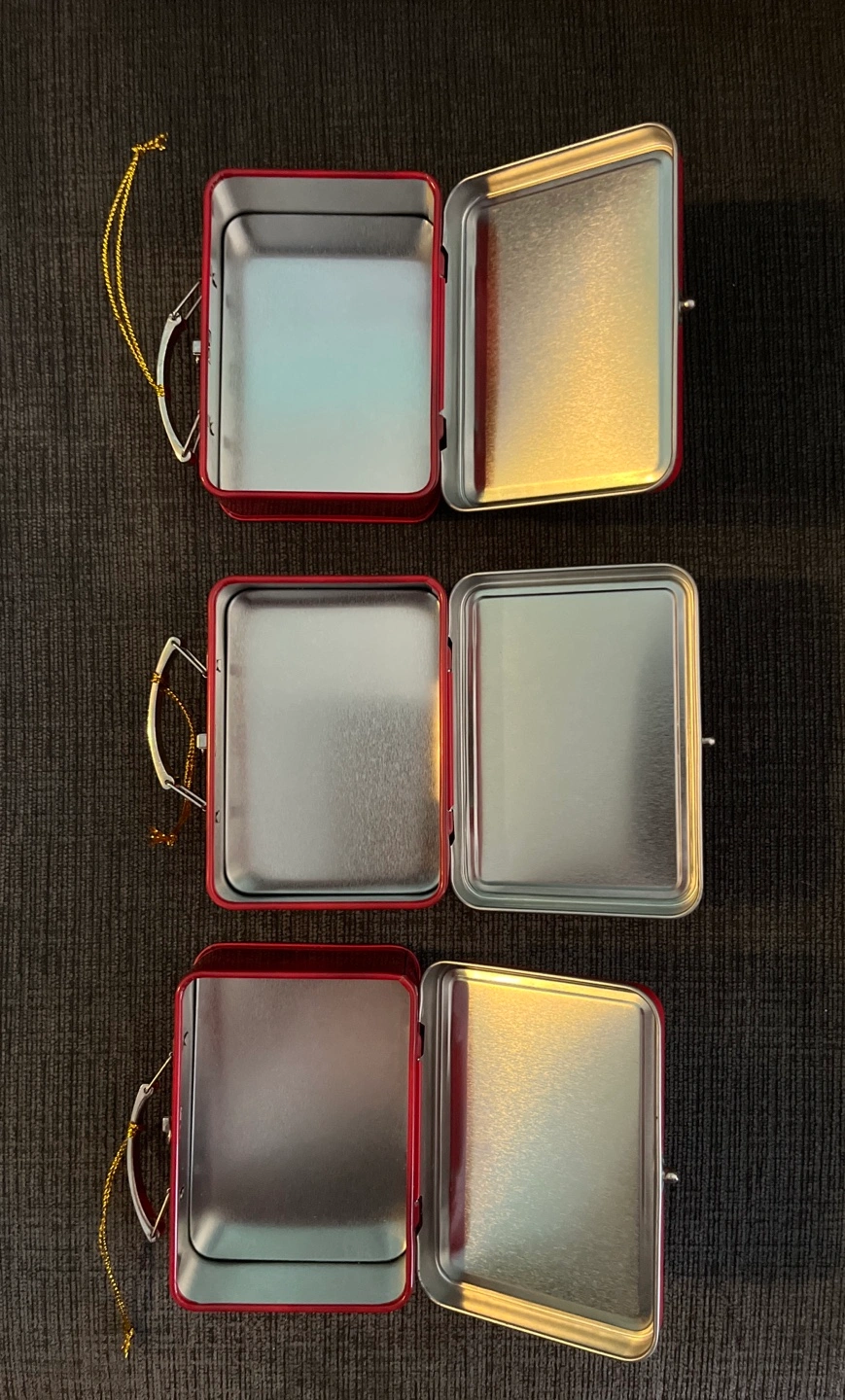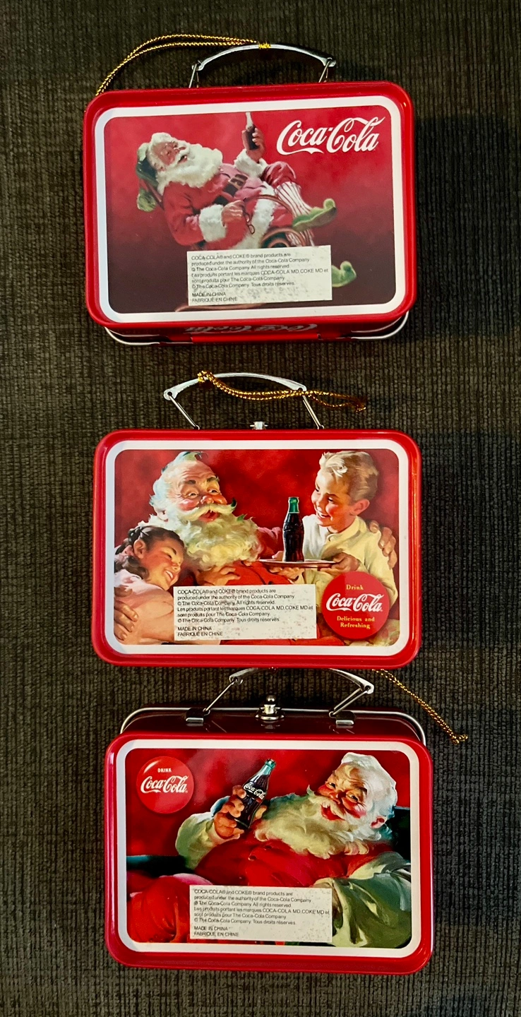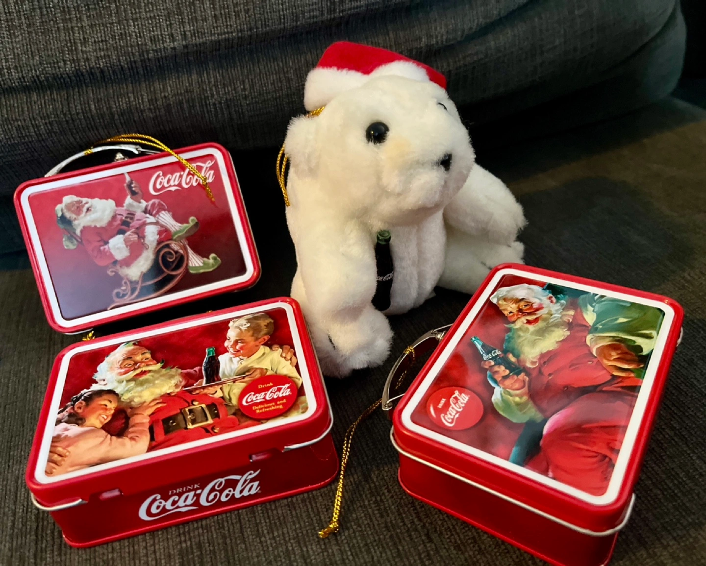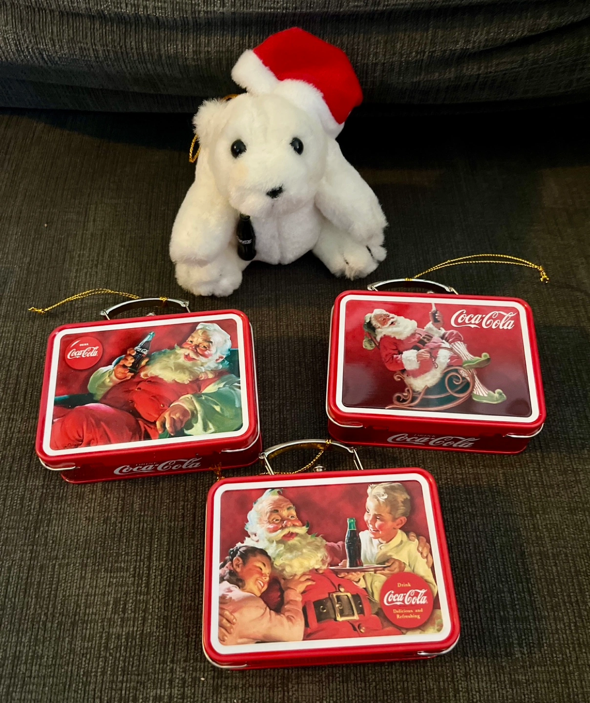 $10 for a group of 4 Coca-cola Christmas tree ornaments/decorations. Three ornaments are little tin boxes that open and feature different images of Santa enjoying a Coke. The strings can be removed to make these non-ornaments. The other ornament is a stuffed polar bear with Santa hat holding a Coke bottle from 1996. Pickup only. St. Clair West & Spadina Road area.
