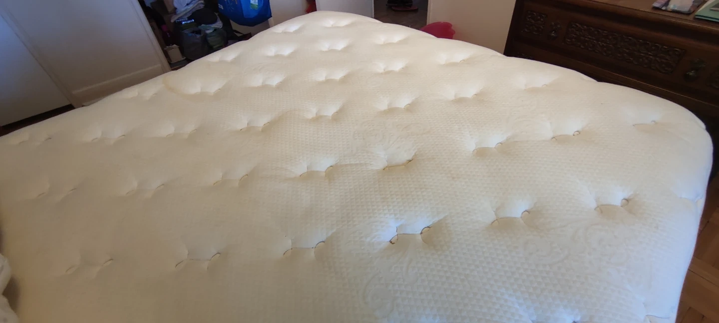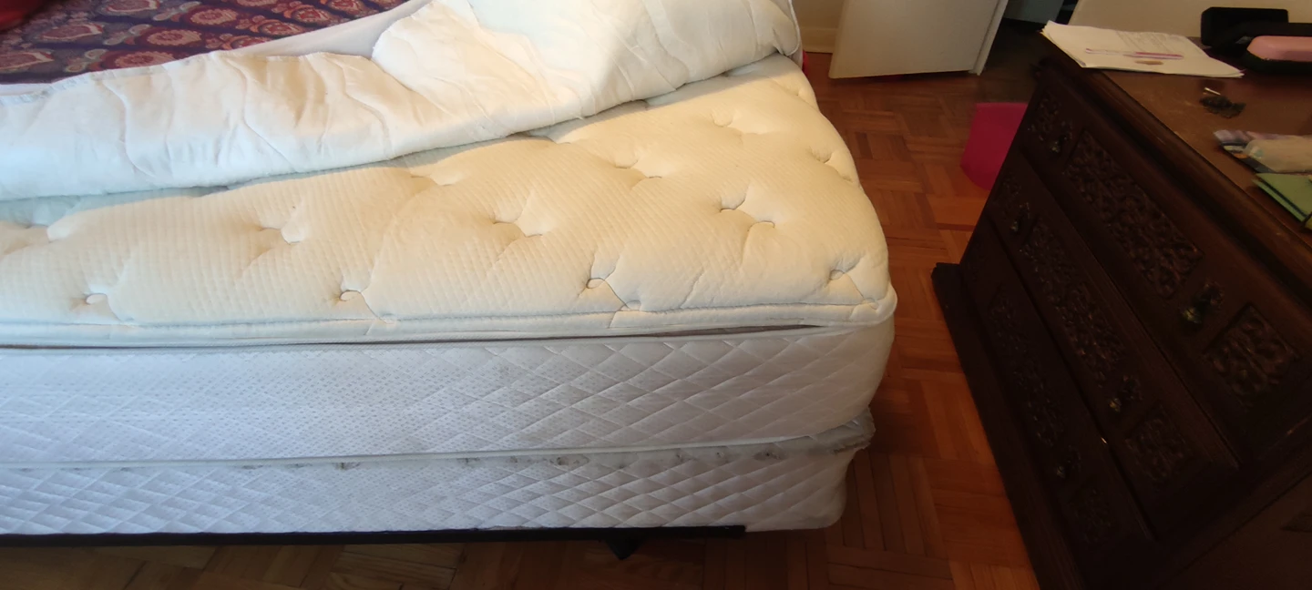 VERY CLEAN and VERY COMFORTABLE, soft queen size pillow top mattress-(very good condition)-with box spring-(fair condition)-and new metal frame-(perfect condition)-plus wooden headboard-(good condition)-all available together. Available for *PICK UP ONLY* at Mt. Pleasant and Eglinton. From a pet free and smoke free home. Thanks! ππΏππΎππ½
