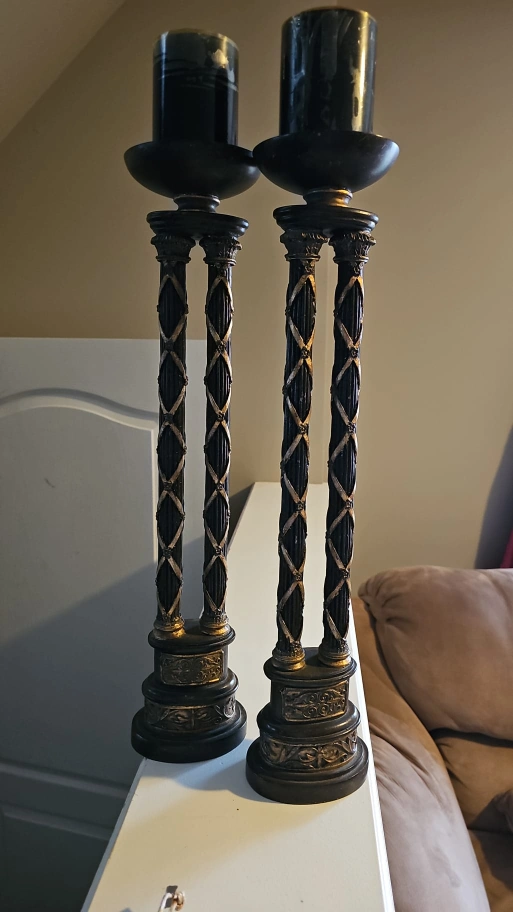 Double pillar, tall black candle holders with gold accents. 21 inches height, can be placed on floor or on tabletop. Selling as a set.