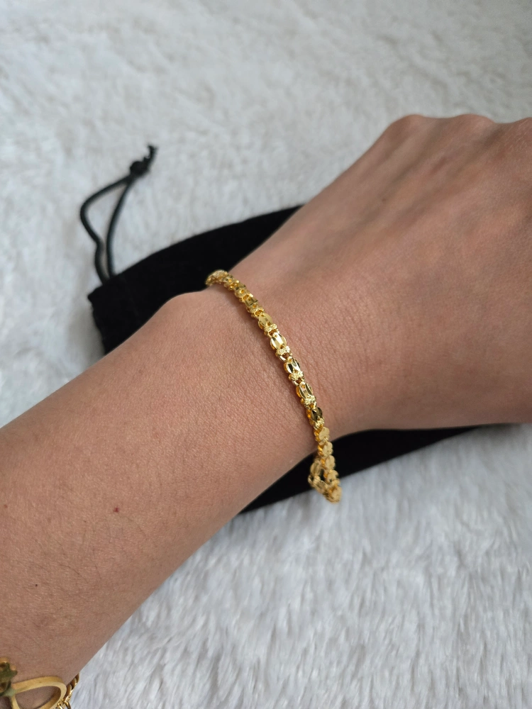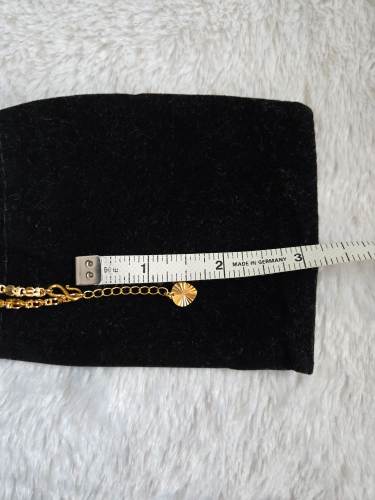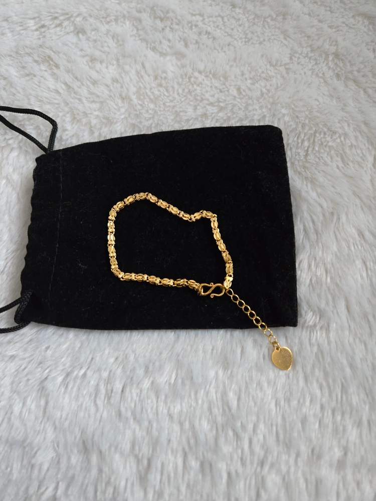 Stainless steel gold plated chain bracelet, about 7 inches long. Comes with a small velvet pouch.