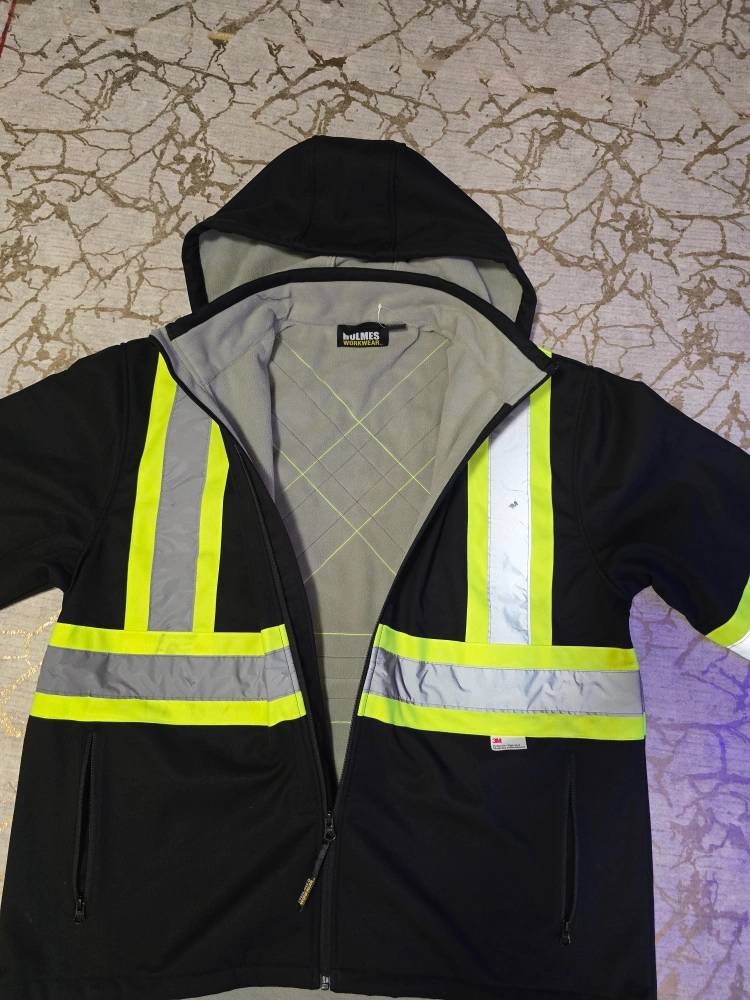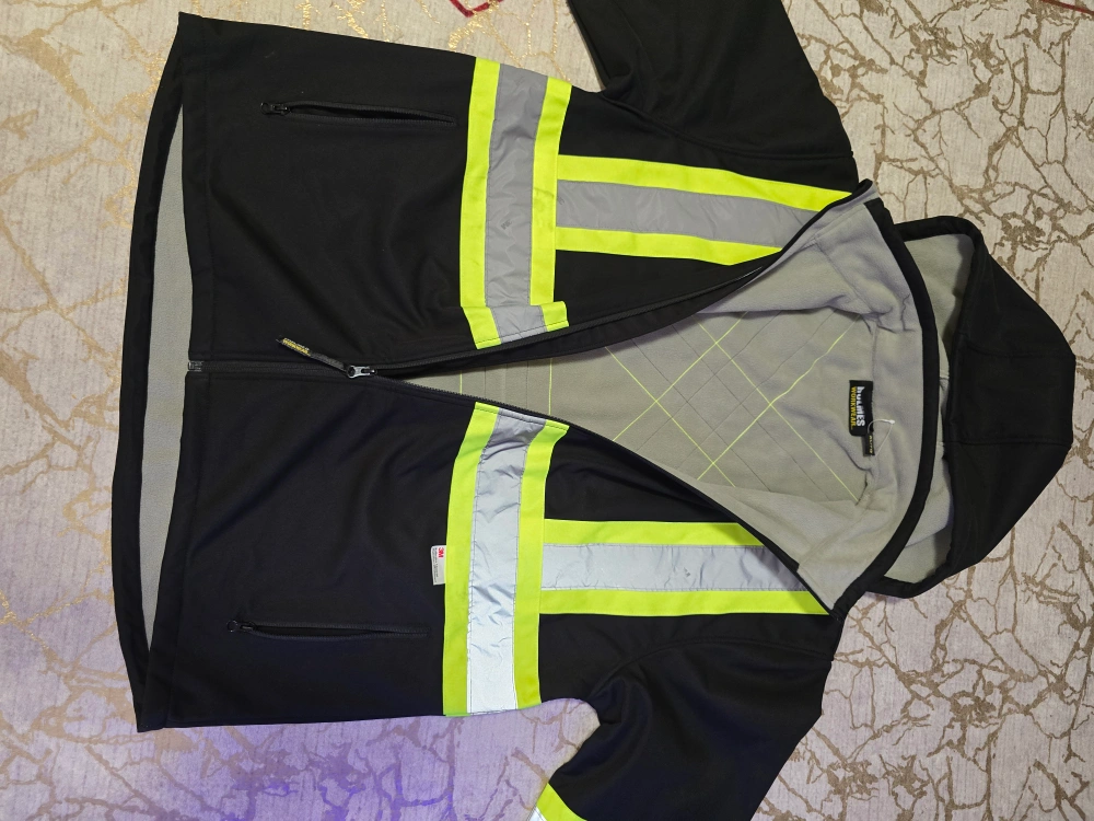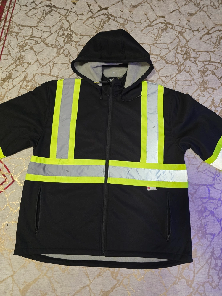Brand new Men's Black safety jacket with a hood and reflective strips. Zipper closure. Two side pockets.Size is XL/TG for more info contact me anytime
