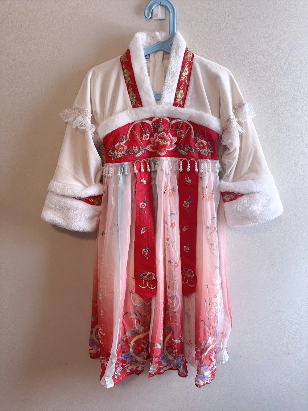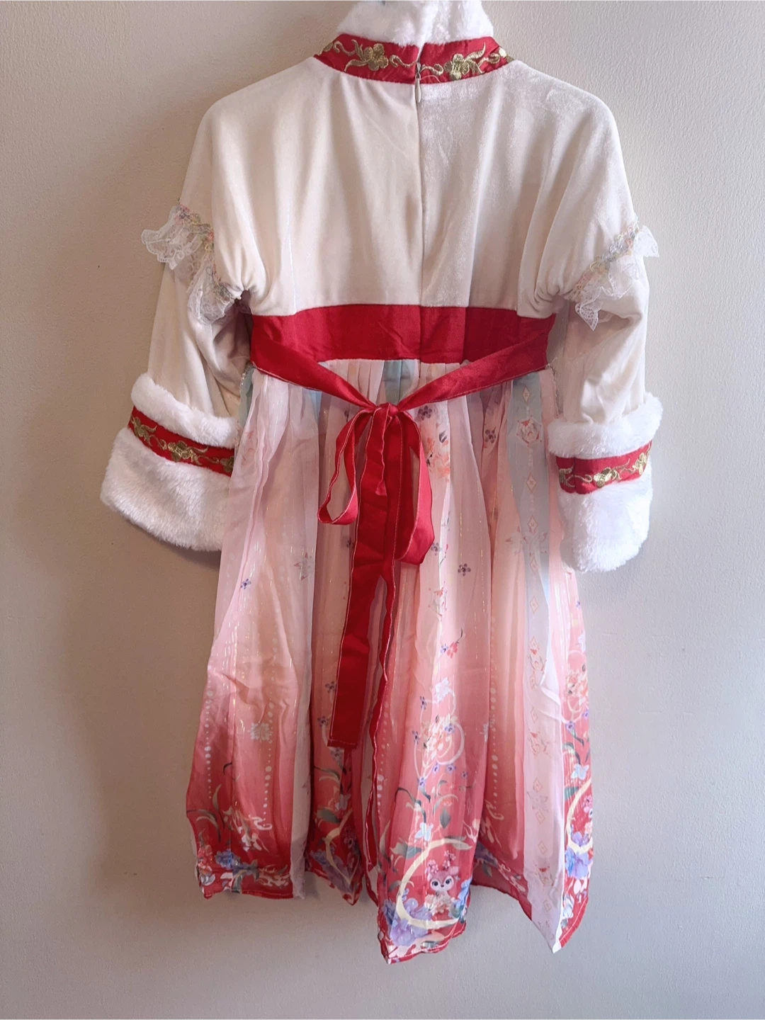 This adorable dress features a cream-coloured velvet-like fabric with white faux fur trim. It's beautifully embellished with red satin ribbon, gold embroidery, and delicate pearl accents. The skirt has a flowy, multi-layered design in shades of pink and white with floral and butterfly prints. It fastens with a red sash at the back. Perfect for cultural events or festive occasions!