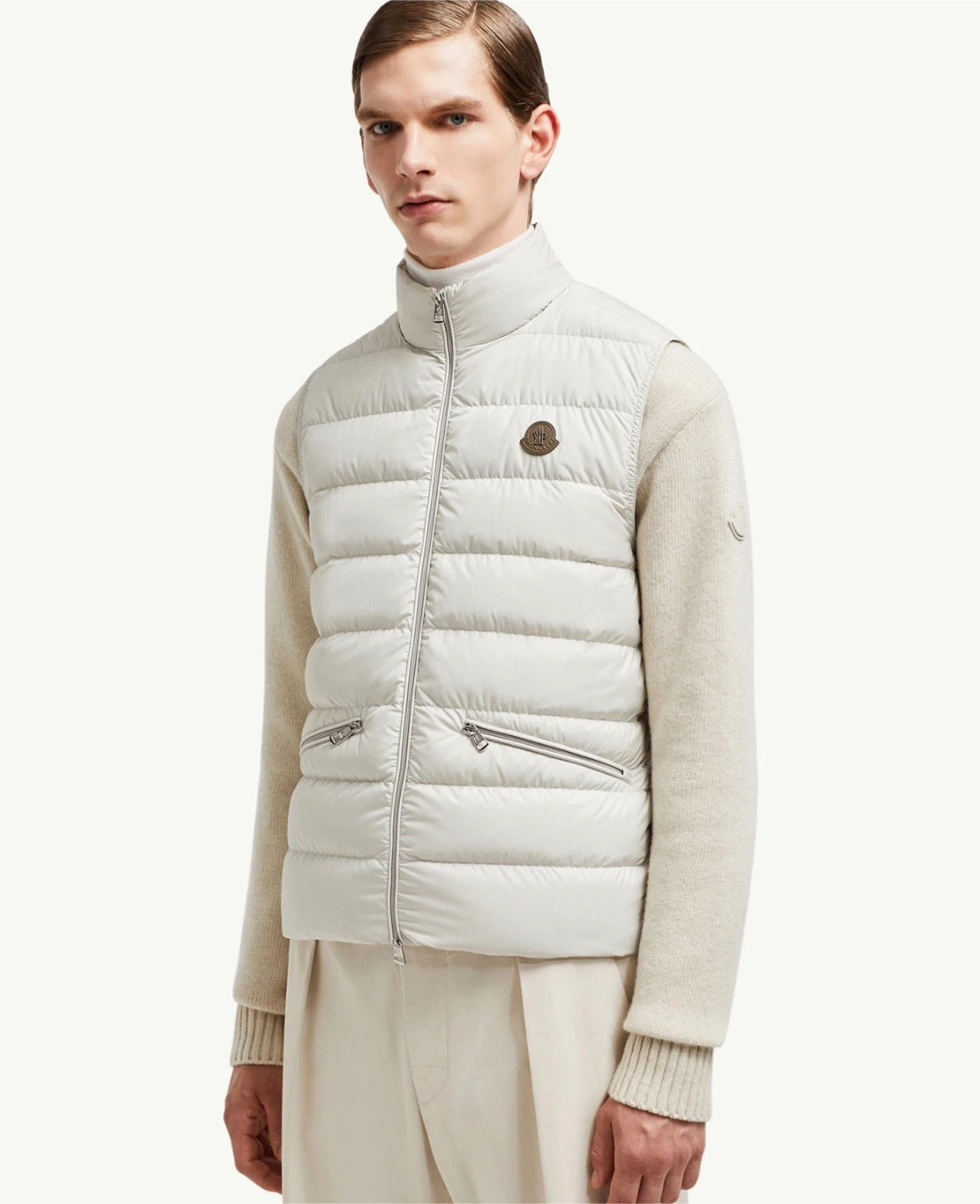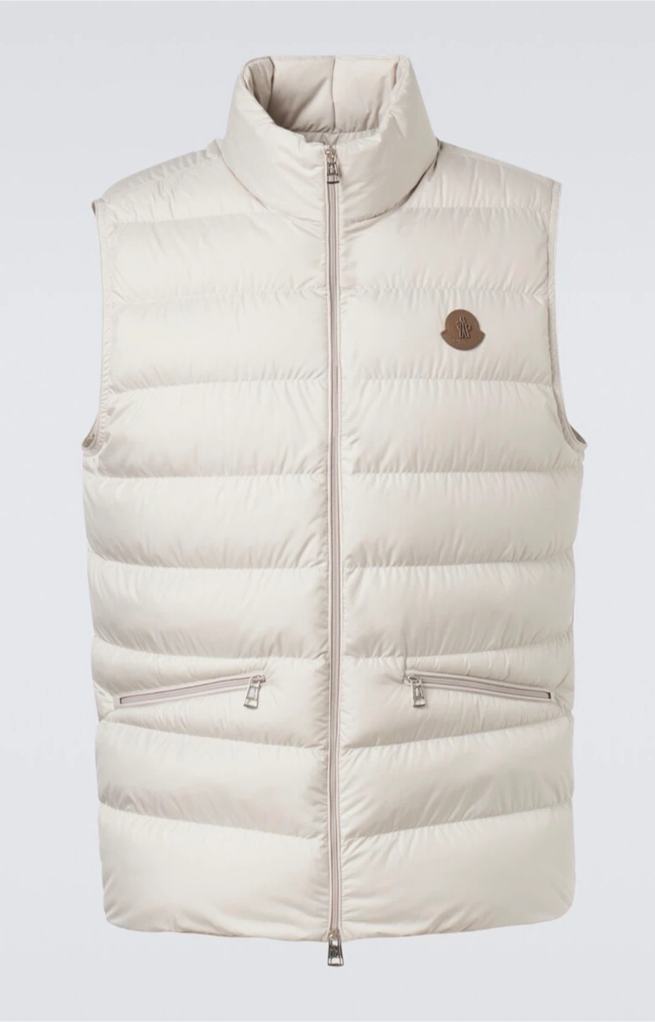 This is a cream Moncler puffer vest. It features a full zip closure and zippered pockets. Padded for warmth and style.