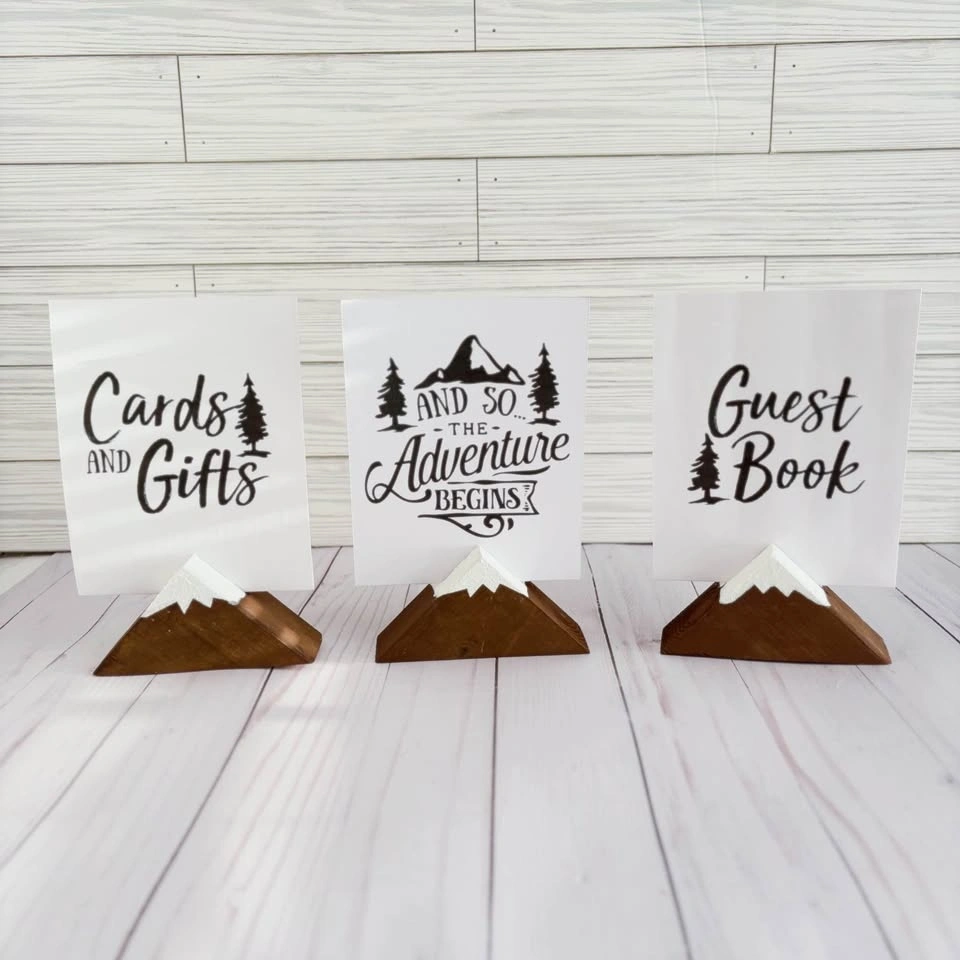 3 wooden mountain card holders with matching signs: "And so the Adventure begins", "Guest Book", "Cards and Gifts". Great for rustic, woodland, adventure or mountain-themed decor. Reusable and versatile – use them for seating assignments, table numbers, menu cards, directions. Perfect for indoor or outdoor events.