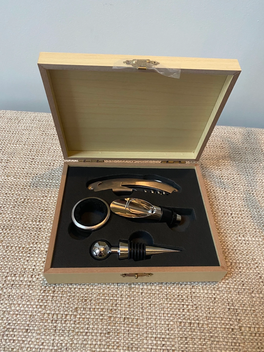 Wine tool set in wooden box. Includes a corkscrew, bottle stopper, and a foil cutter.