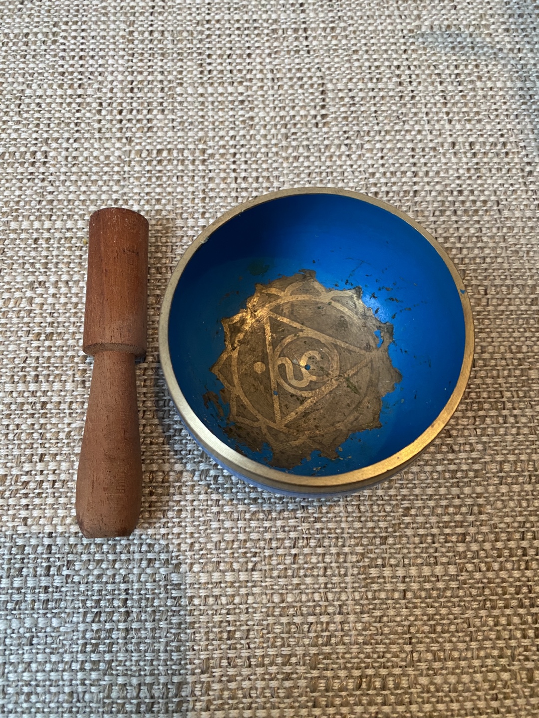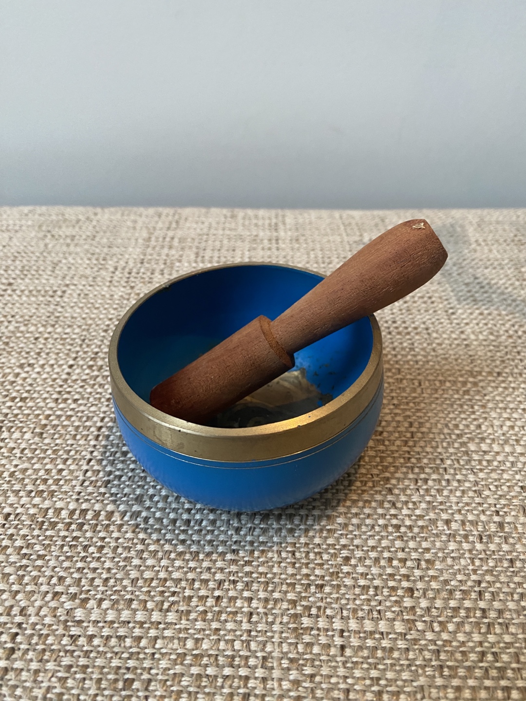 Small singing bowl with a wooden striker. Blue with a gold rim and a gold symbol on the bottom. Great for meditation or relaxation.