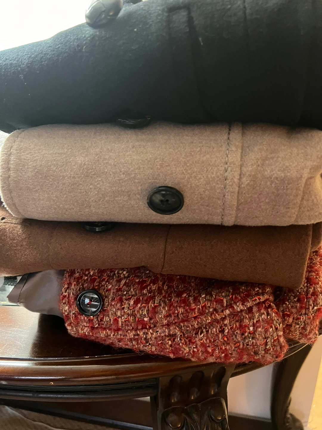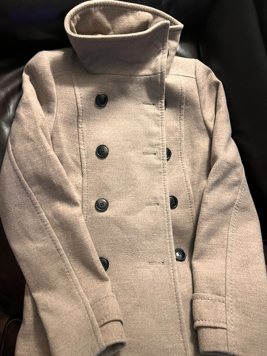 Four slightly used casual coats in various colours and sizes. Double-breasted style, trench coat, Includes a black tatula size xs, brown h&m size s, Zara trench coat red small, and tan Cleo coat size 8. All for $15.