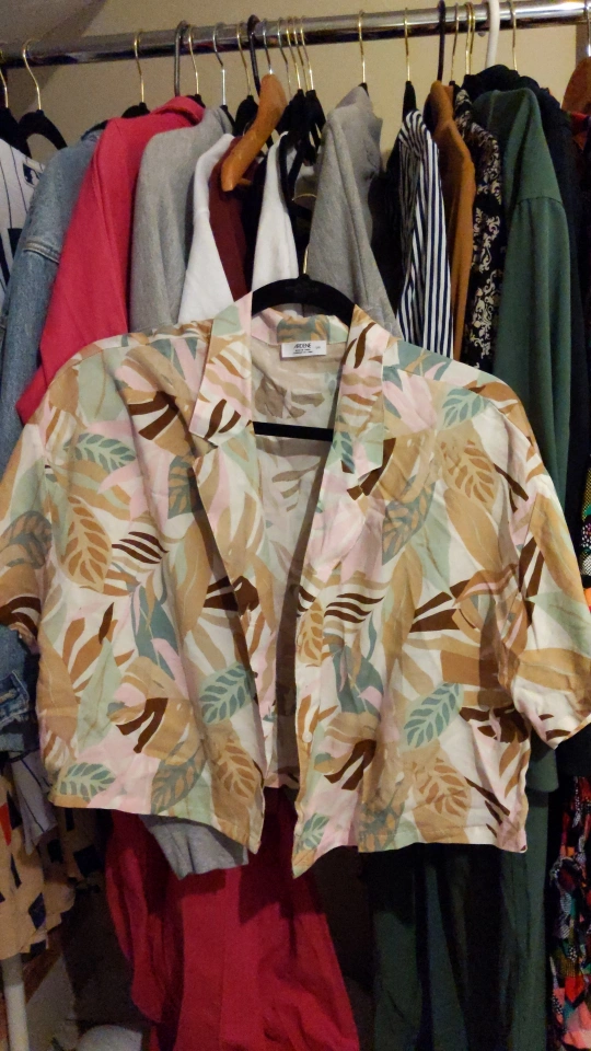Short sleeve cropped button up shirt with a floral plant leaf pattern.
