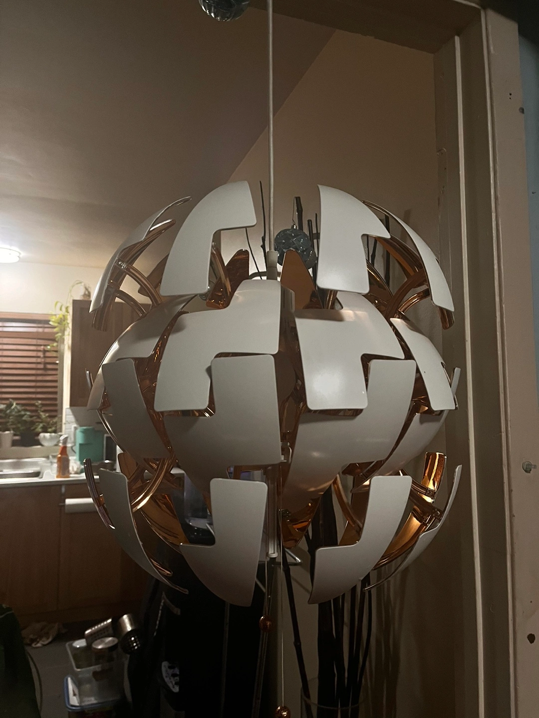Modern pendant light with white and gold accents. The light features a unique geometric design.