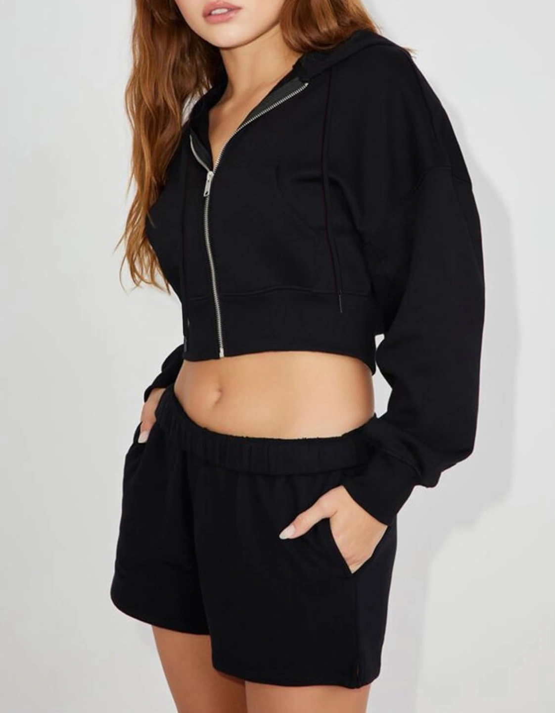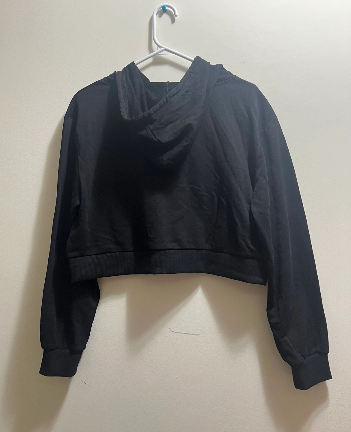 Black cropped hoodie with a zipper. It has a hood and long sleeves.