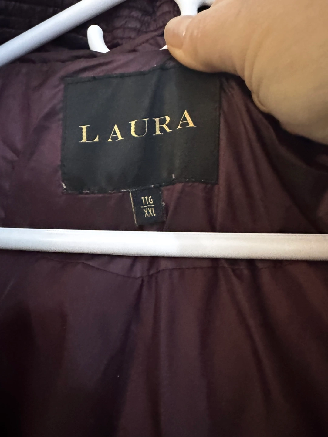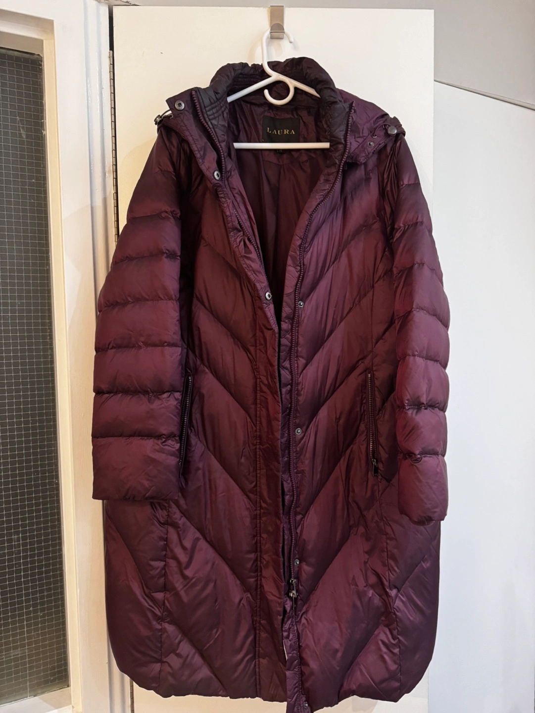 Long burgundy puffer jacket with a hood. Size 11G/XXL.