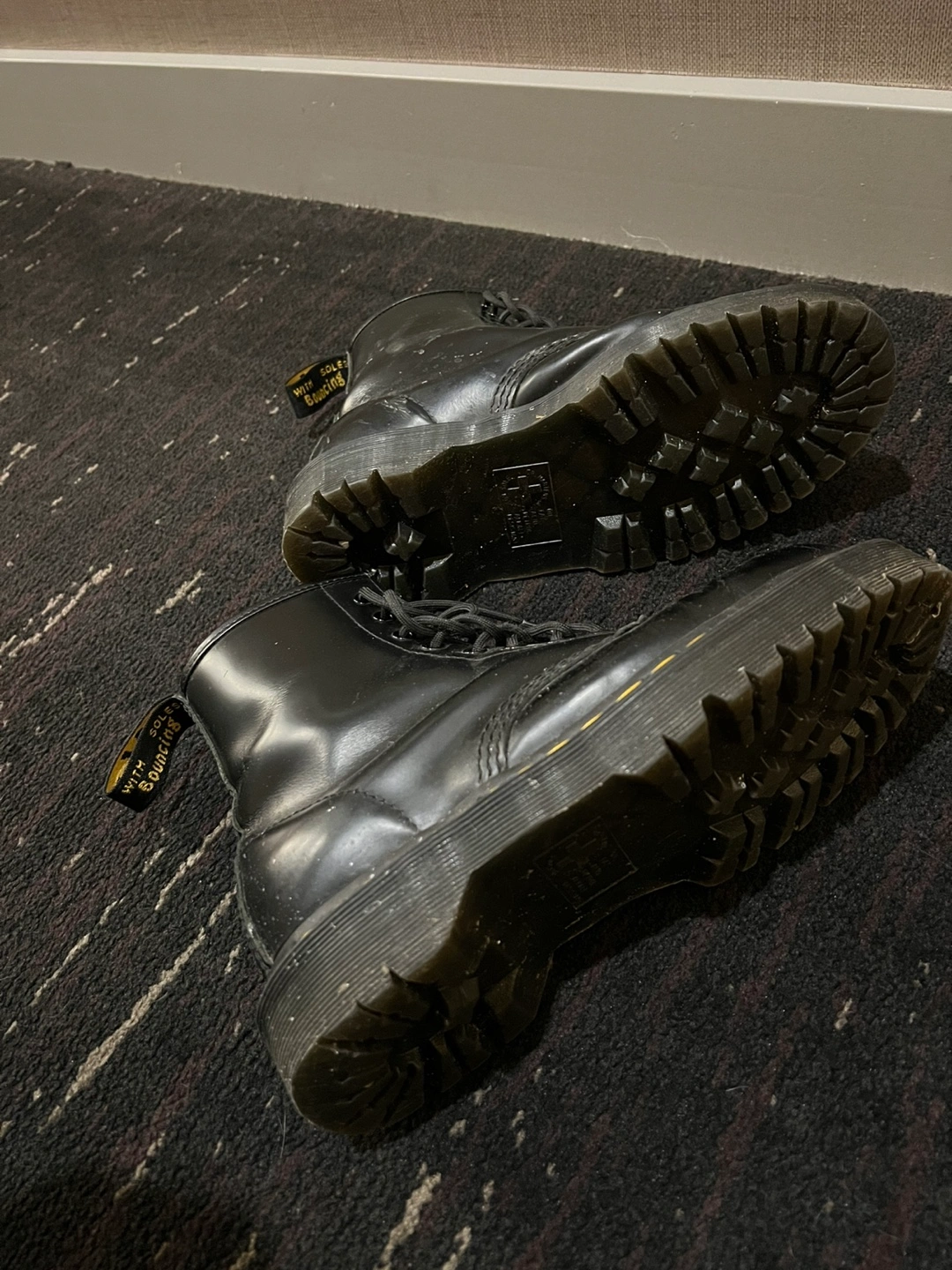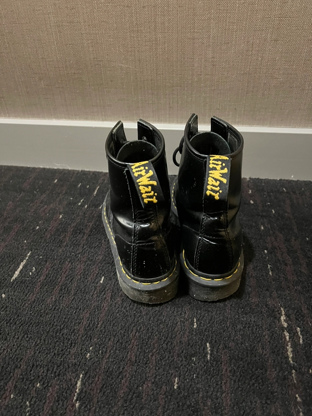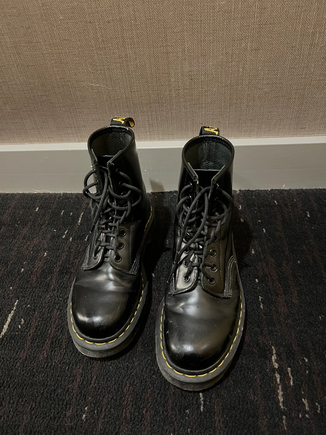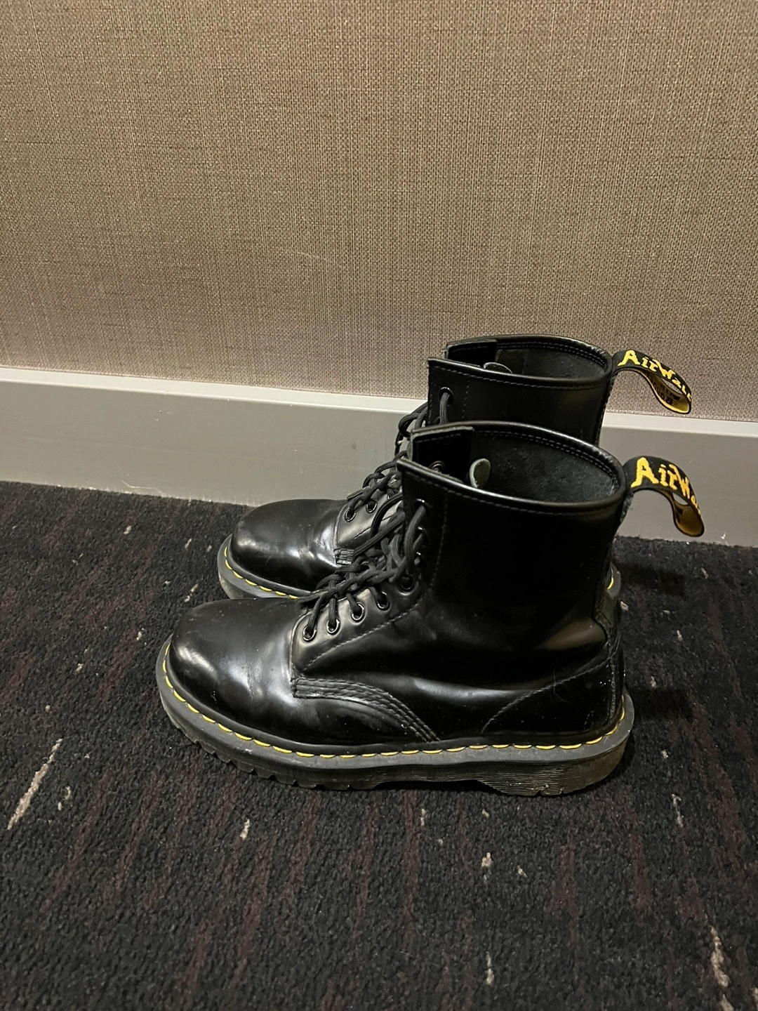 Black leather Dr. Martens boots with yellow stitching. Accepting best offer. Can meet Bloor-Yonge or Church / Wellesley.
