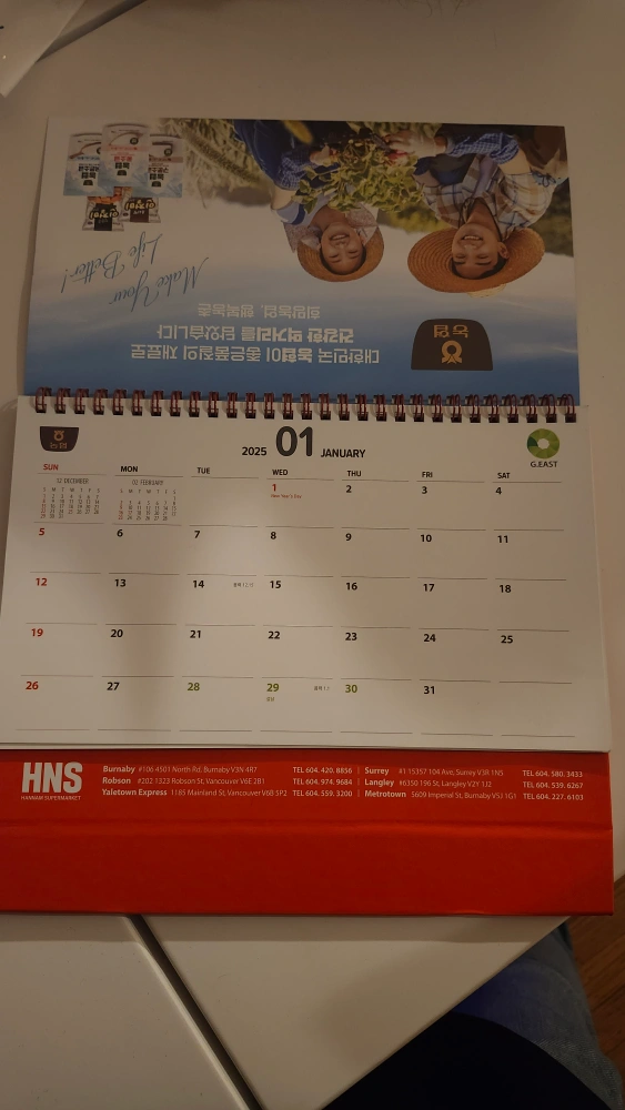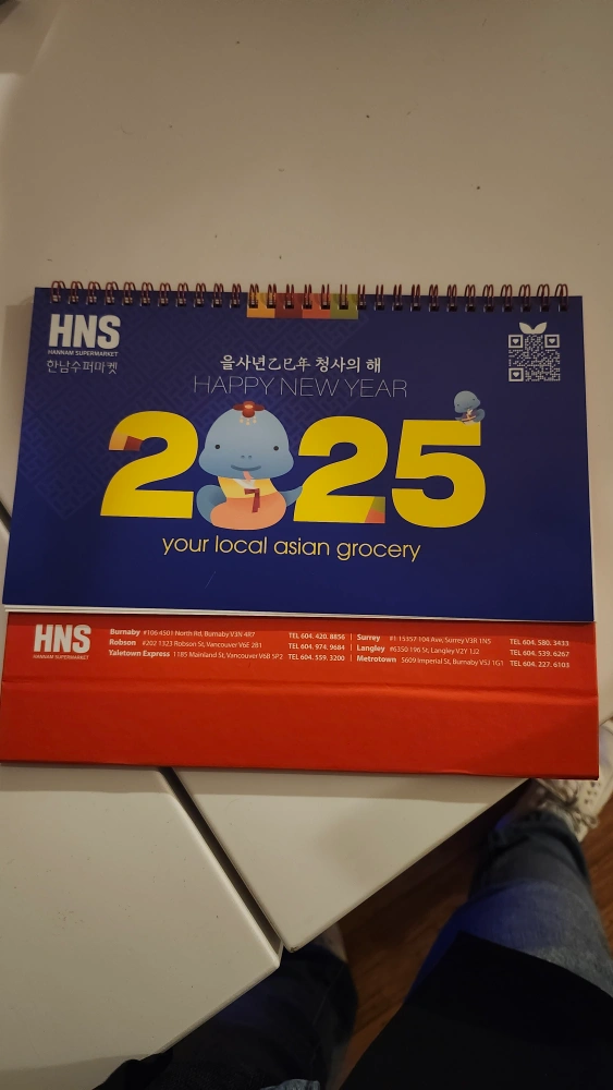 Calendar for 2025, featuring a cartoon of a smiling sea creature holding up a 2025. Korean characters are included in the calendar's design.
