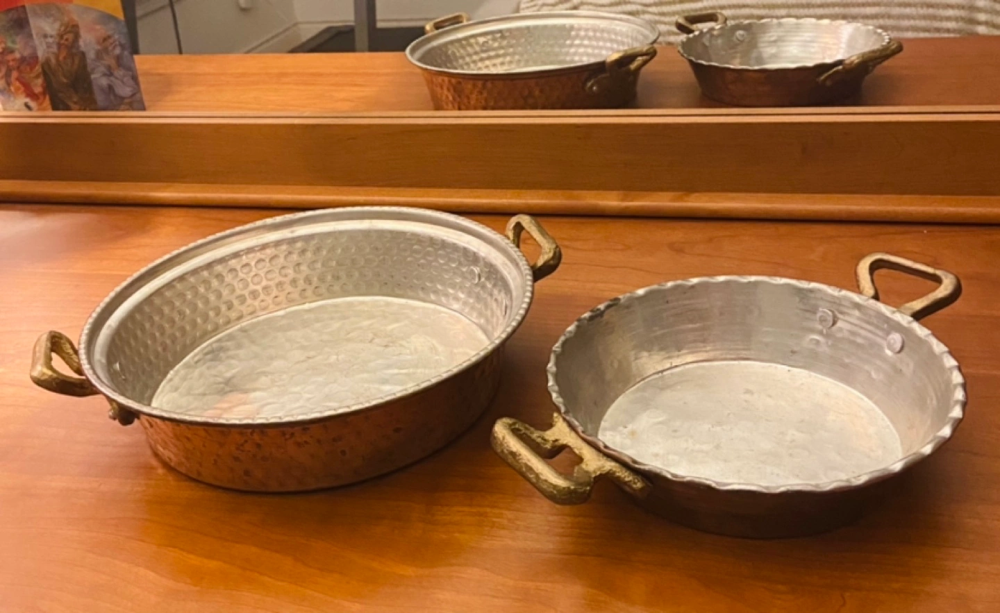 Set of two copper cooking pans with brass handles. Both have hammered finishes and scalloped edges.