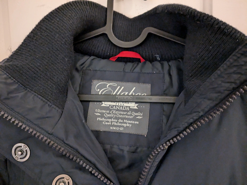 Long puffer winter coat with faux fur hood and zipper and button closure. Very warm.