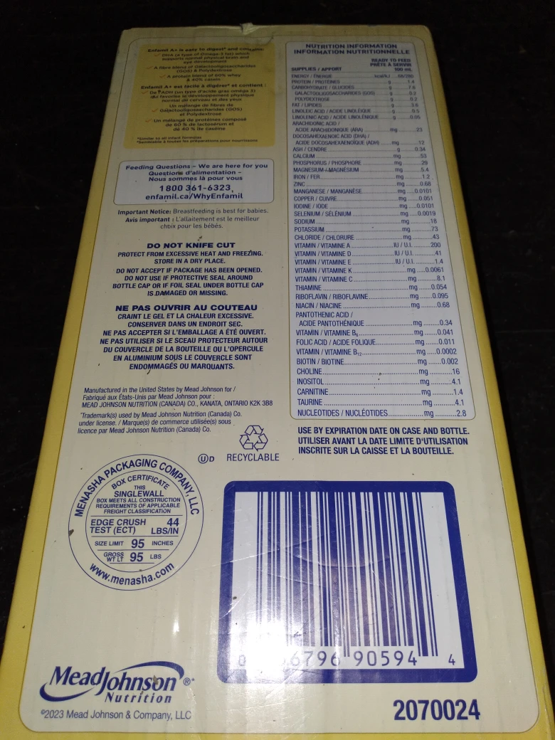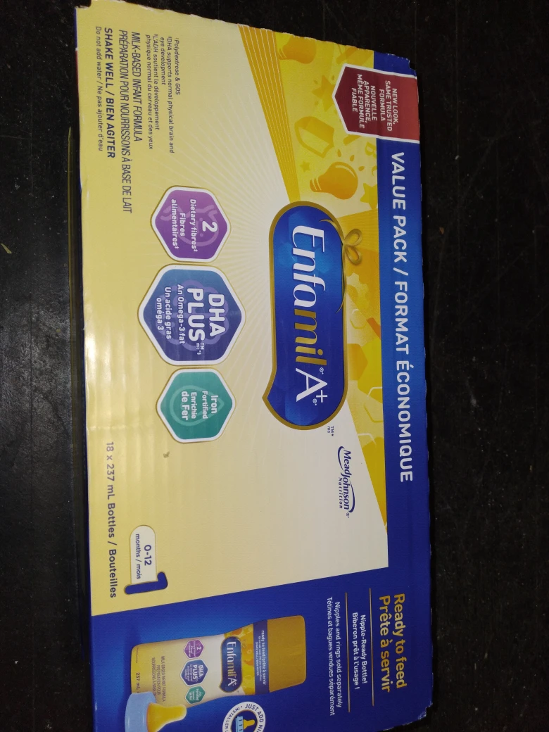 Value pack / Format économique. Ready to feed. Prete a servir. 18 / 237 mL Bottles / Bouteilles. DHA Plus. Iron / Fer. 2x more DHA than our leading competitor's milk-based formula. From the #1 Doctor Recommended Brand. MeadJohnson Nutrition. C+12