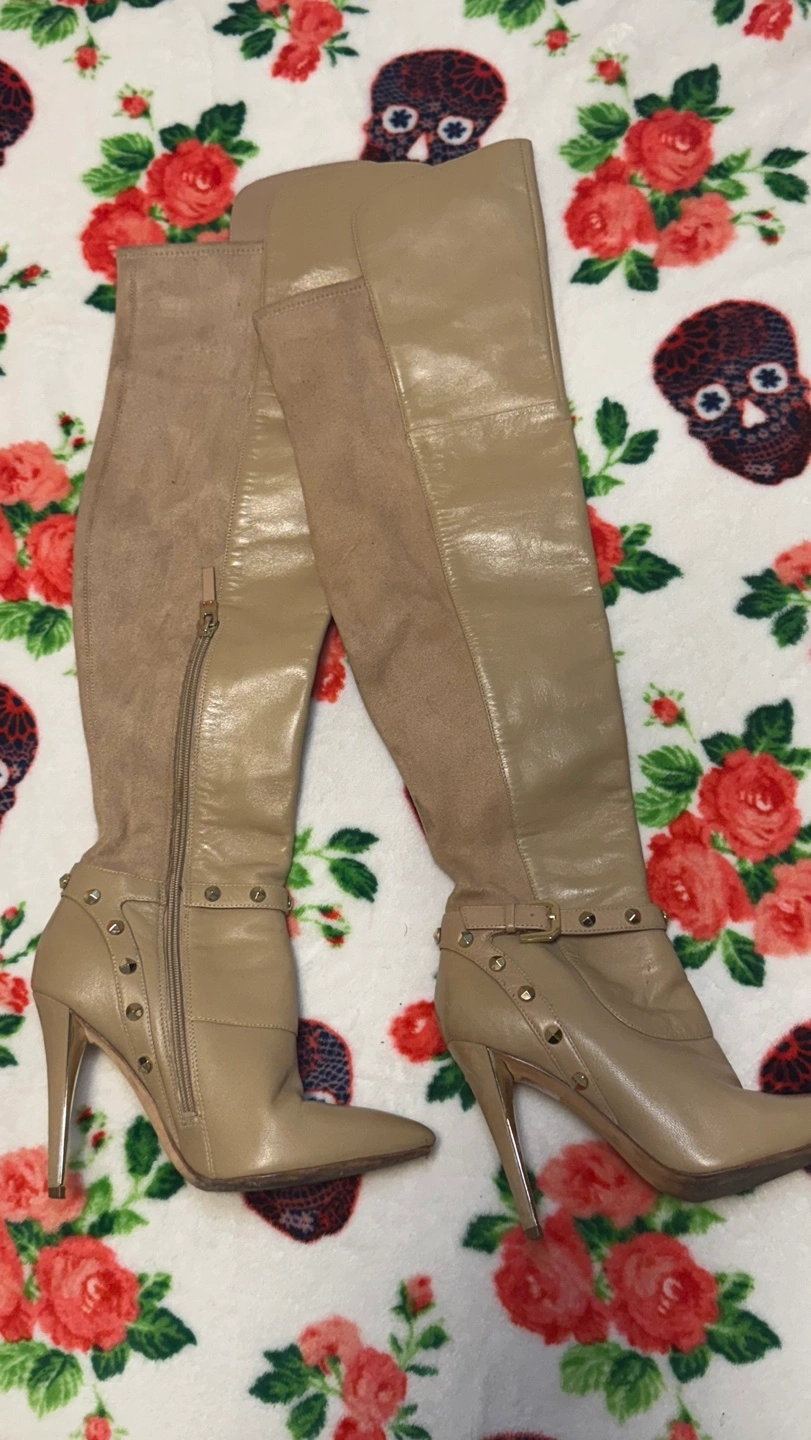 Very good condition. Only wear is on the sole. Marciano Knee High Boots size 7 Over the knee boots with a stiletto heel and a buckle detail at the ankle. The boots are made of leather and suede. Leather soles. Paid around $450