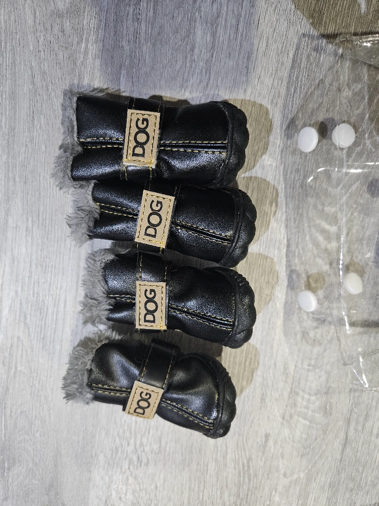 Set of four black dog boots. Faux leather with fur lining. Adjustable strap. Size 2 . Brand new, never worn.