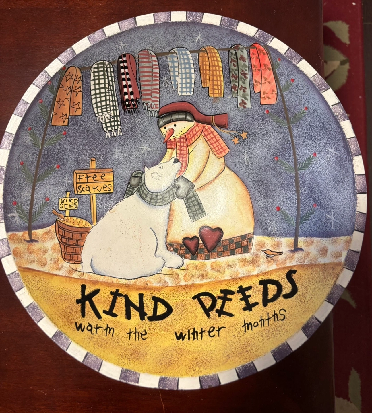 Hand-painted decorative WOODEN bowl featuring a snowman and a polar bear. The plate is round with a rim and reads "Kind Deeds Warm the Winter Months".