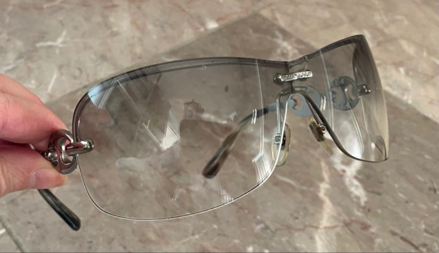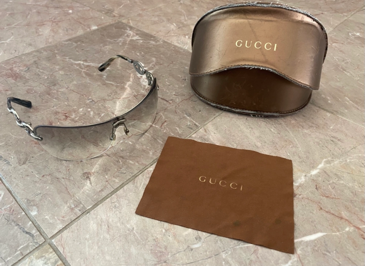 Gucci sunglasses with chain detail and a brown case and cleaning cloth. Original price 550$