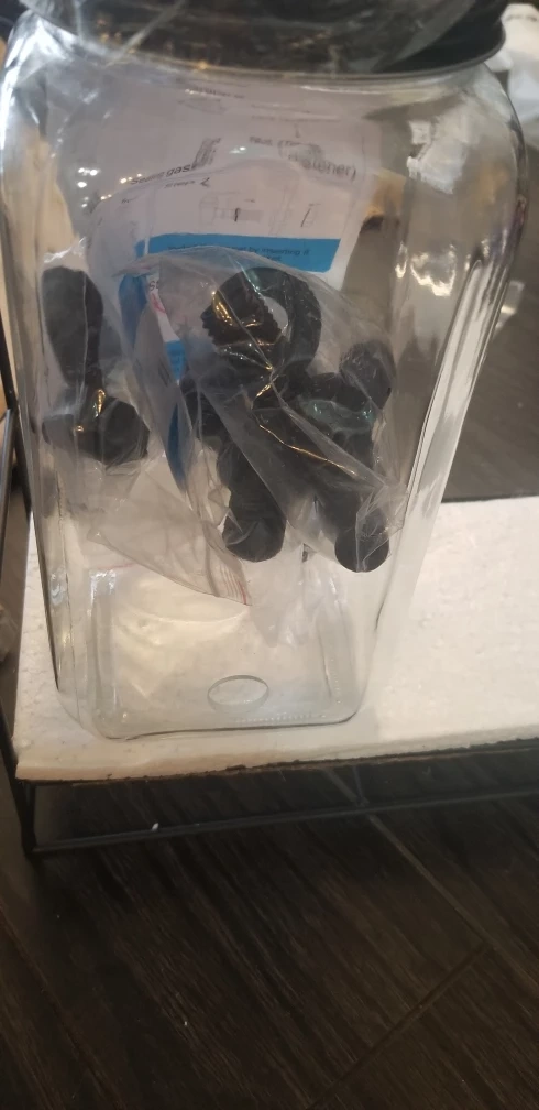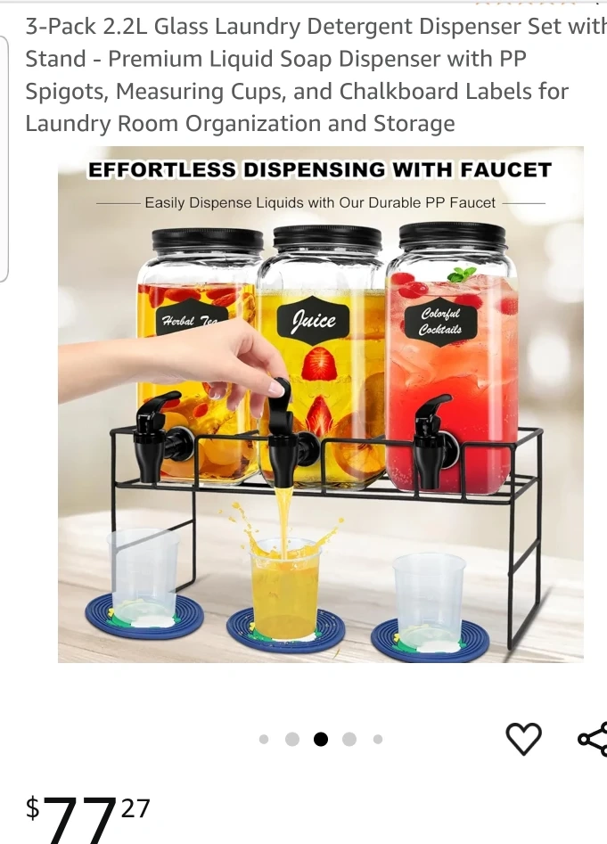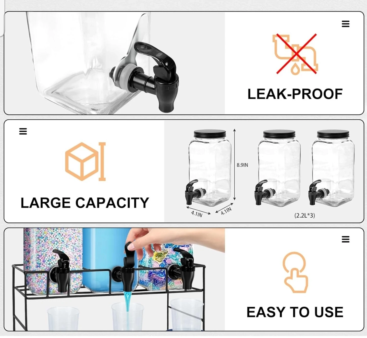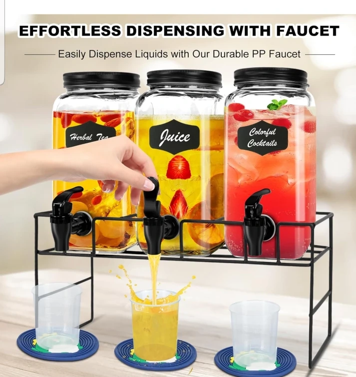 Glass liquid dispensers with metal stand, 3 measuring cups, and chalkboard labels. Easy to use and leak-proof.
