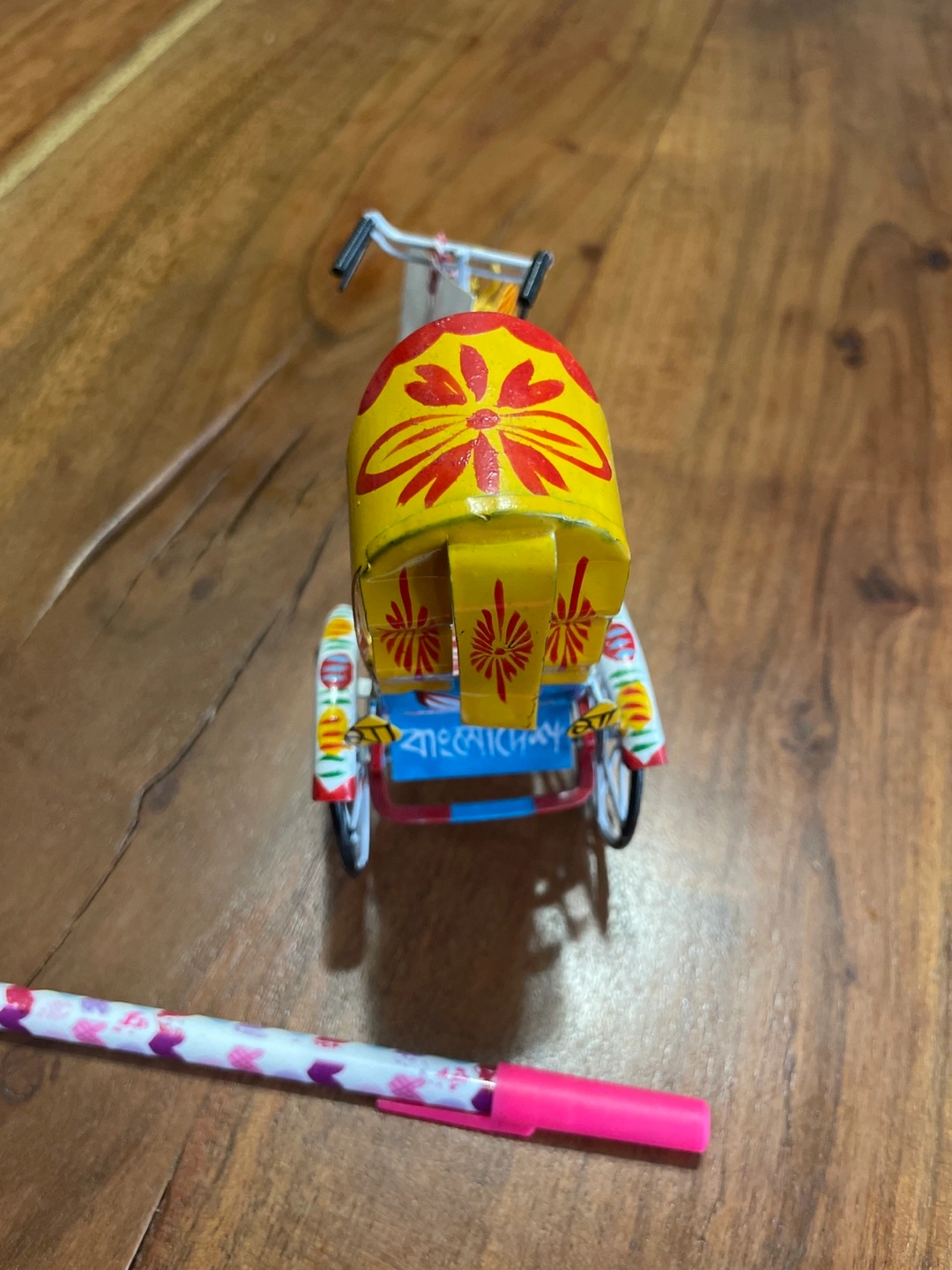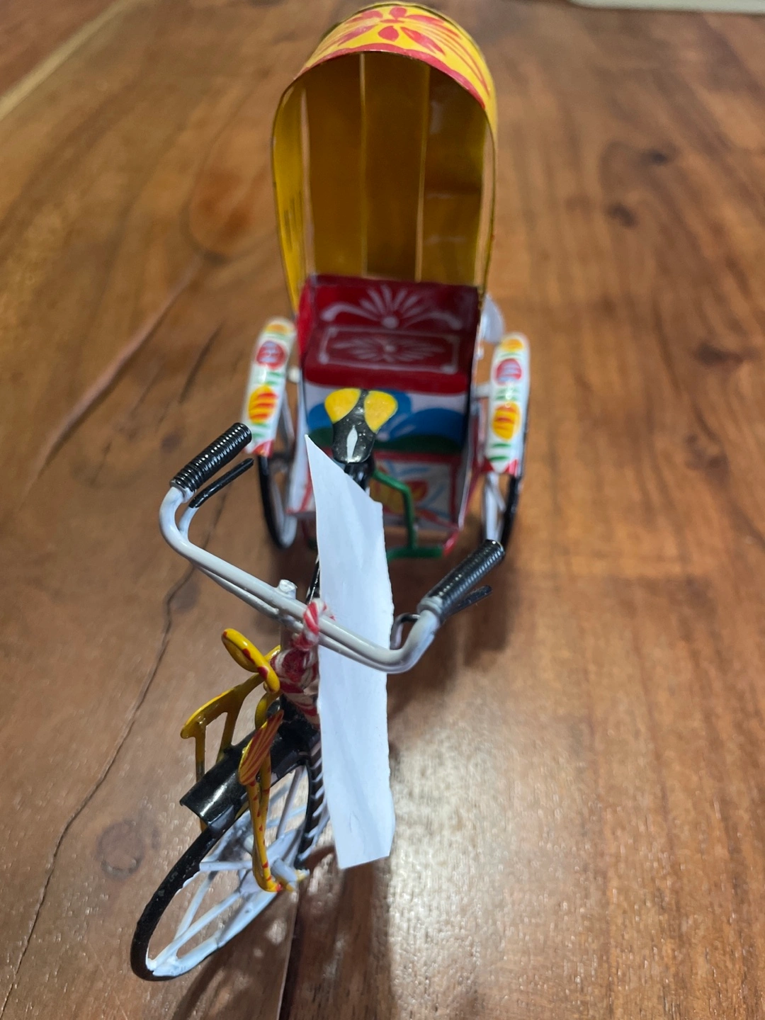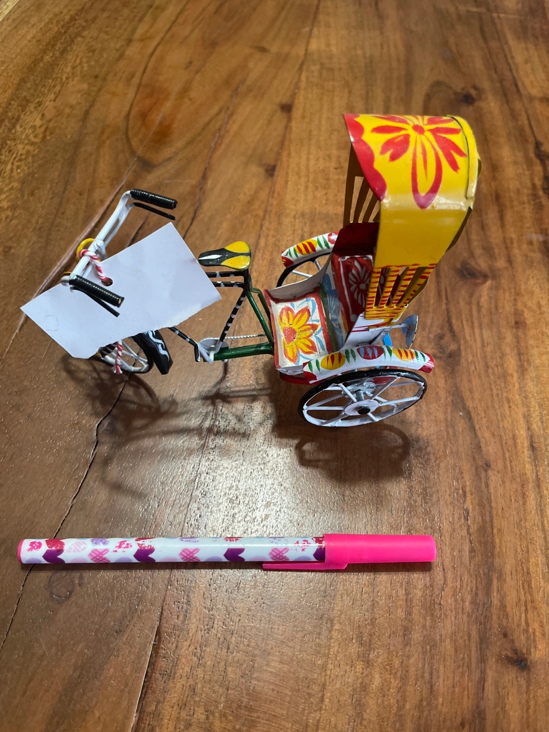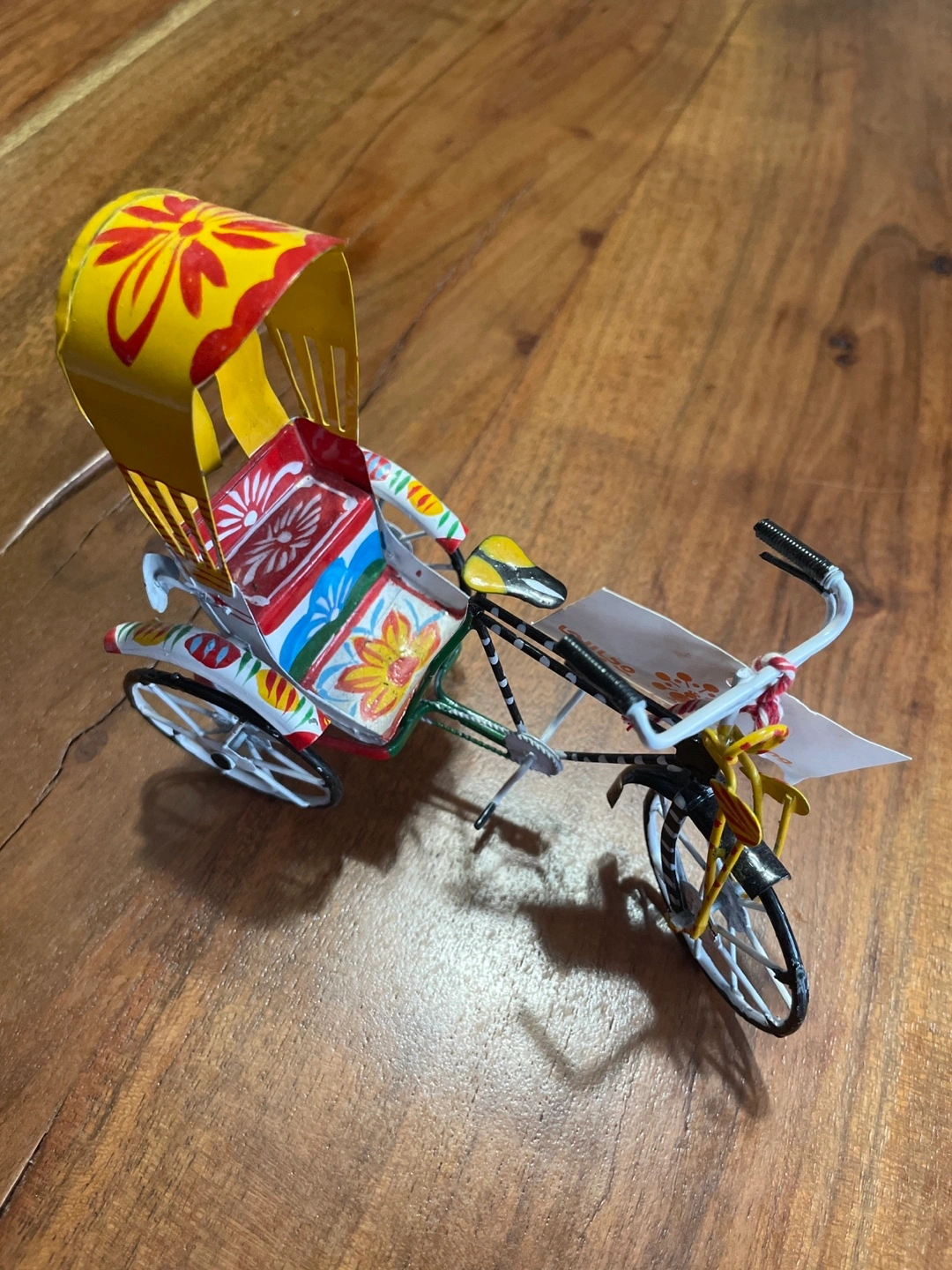 513Hand painted metal rickshaw bike, brightly coloured with floral designs, wheels turn freely. Great for a child's playroom or as a collectible.